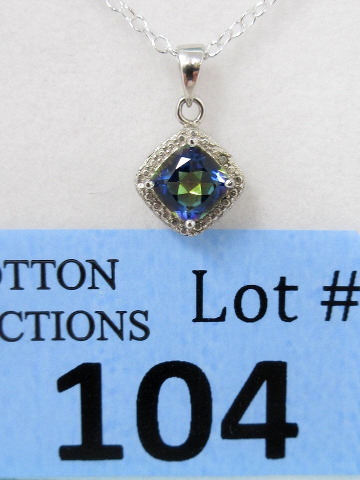 Princess cut, ocean blue colour topaz. Includes chain & $250 certificate.