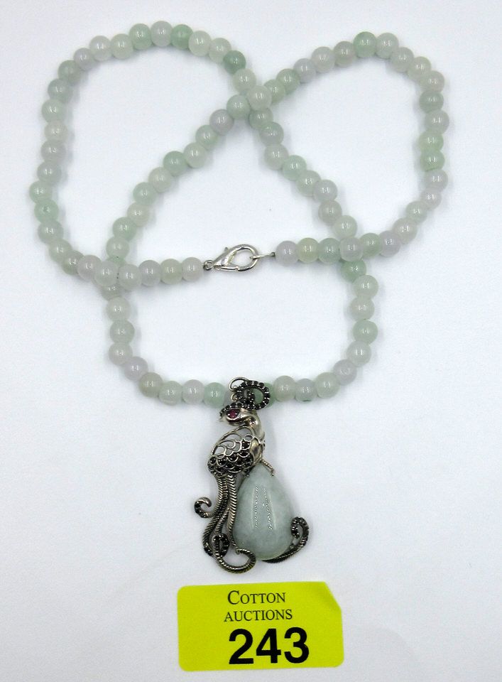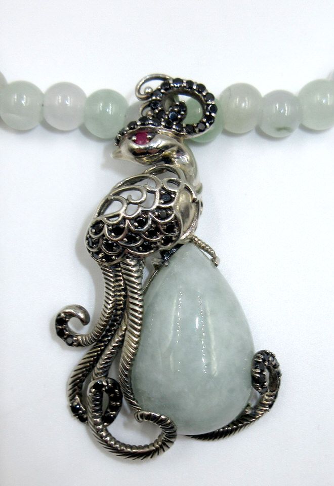 Polished gemstone pendant with red and blue accent stones on a 26" bead necklace (clasp is not sterling). Pendant is 33 mm x 60 mm and the beads are 8 mm.