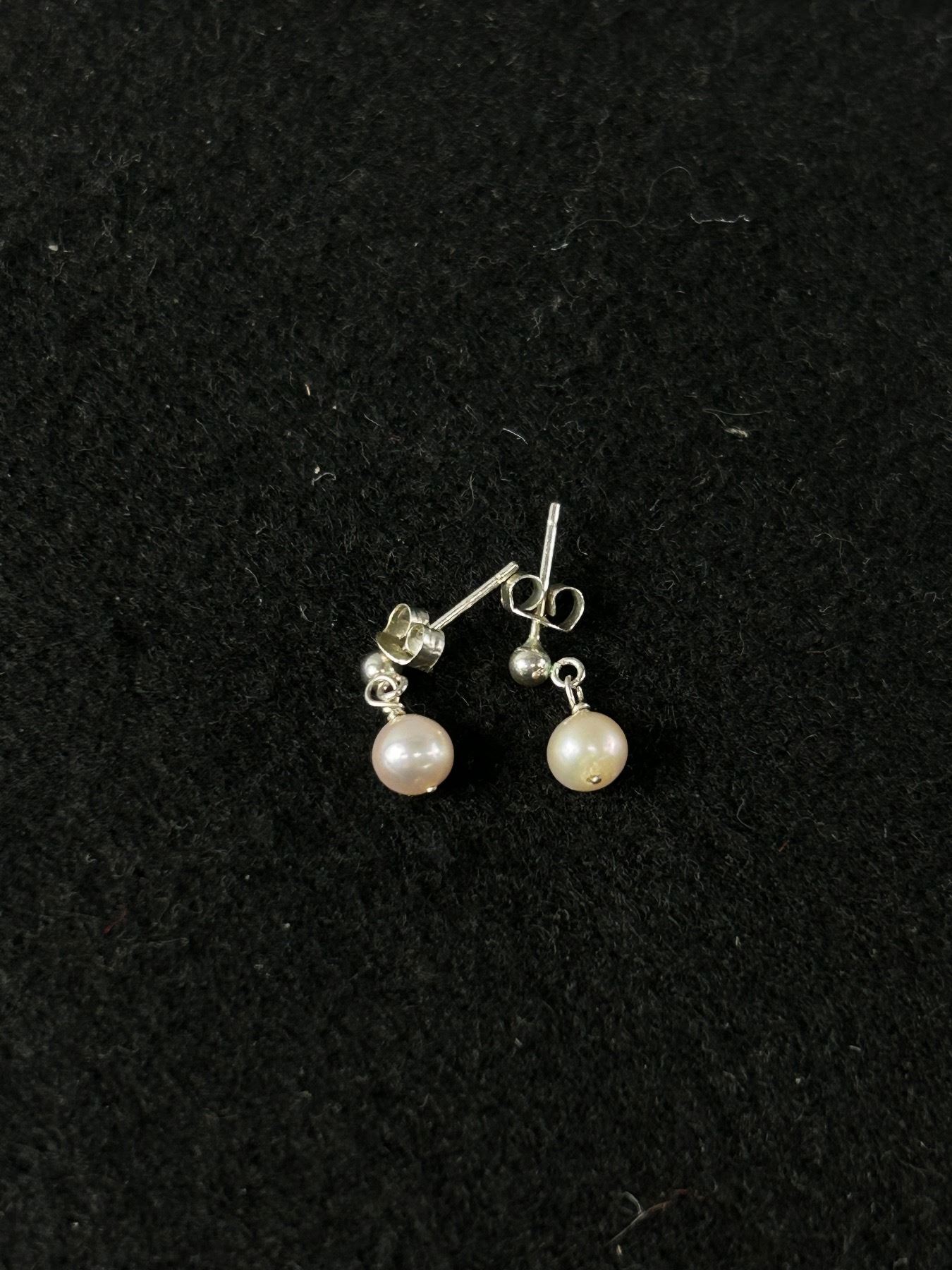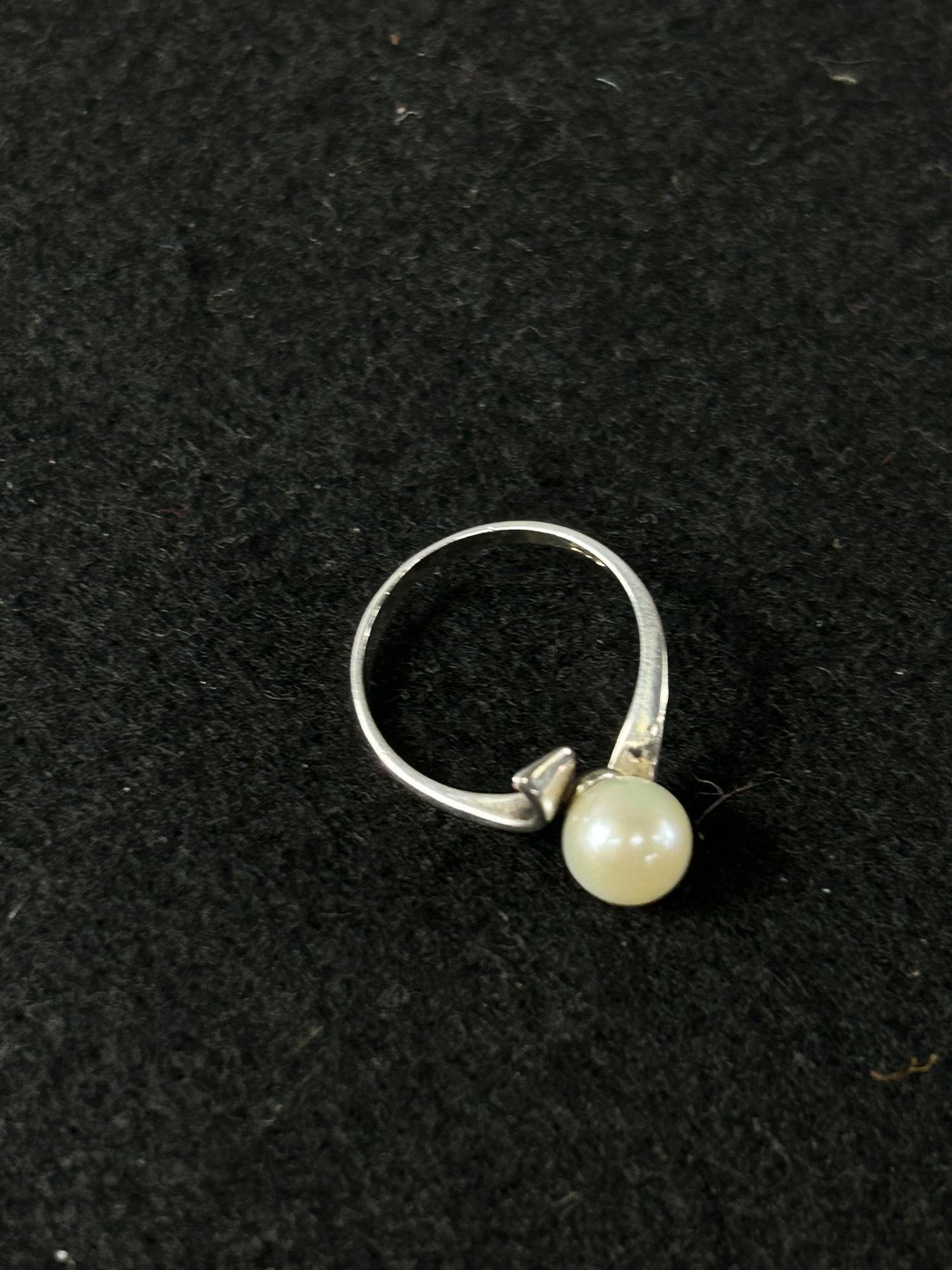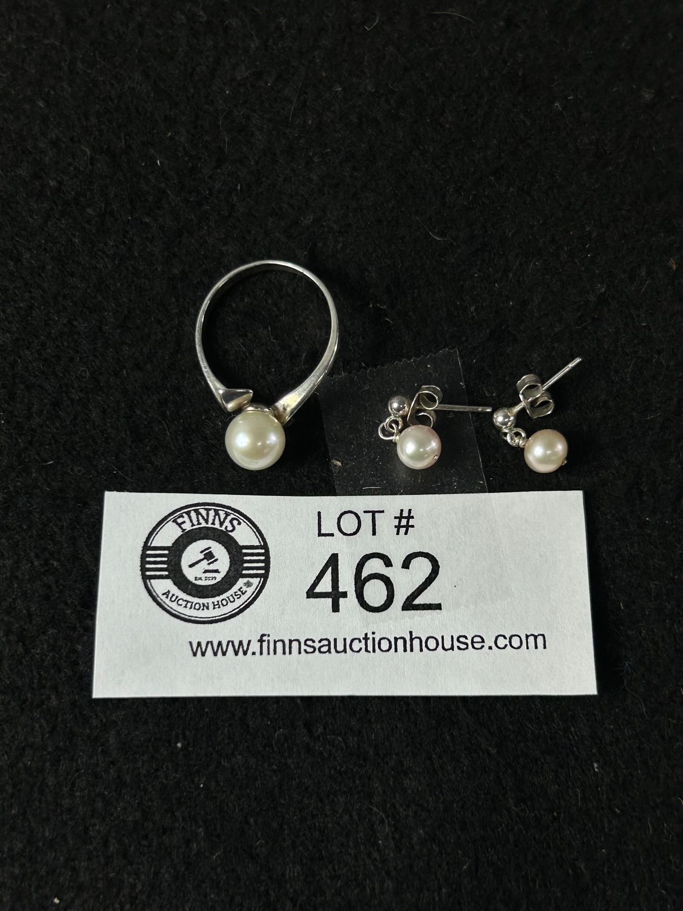 Sterling Silver w/ Genuine Pearl Ring + Pair of Earrings Marked 925