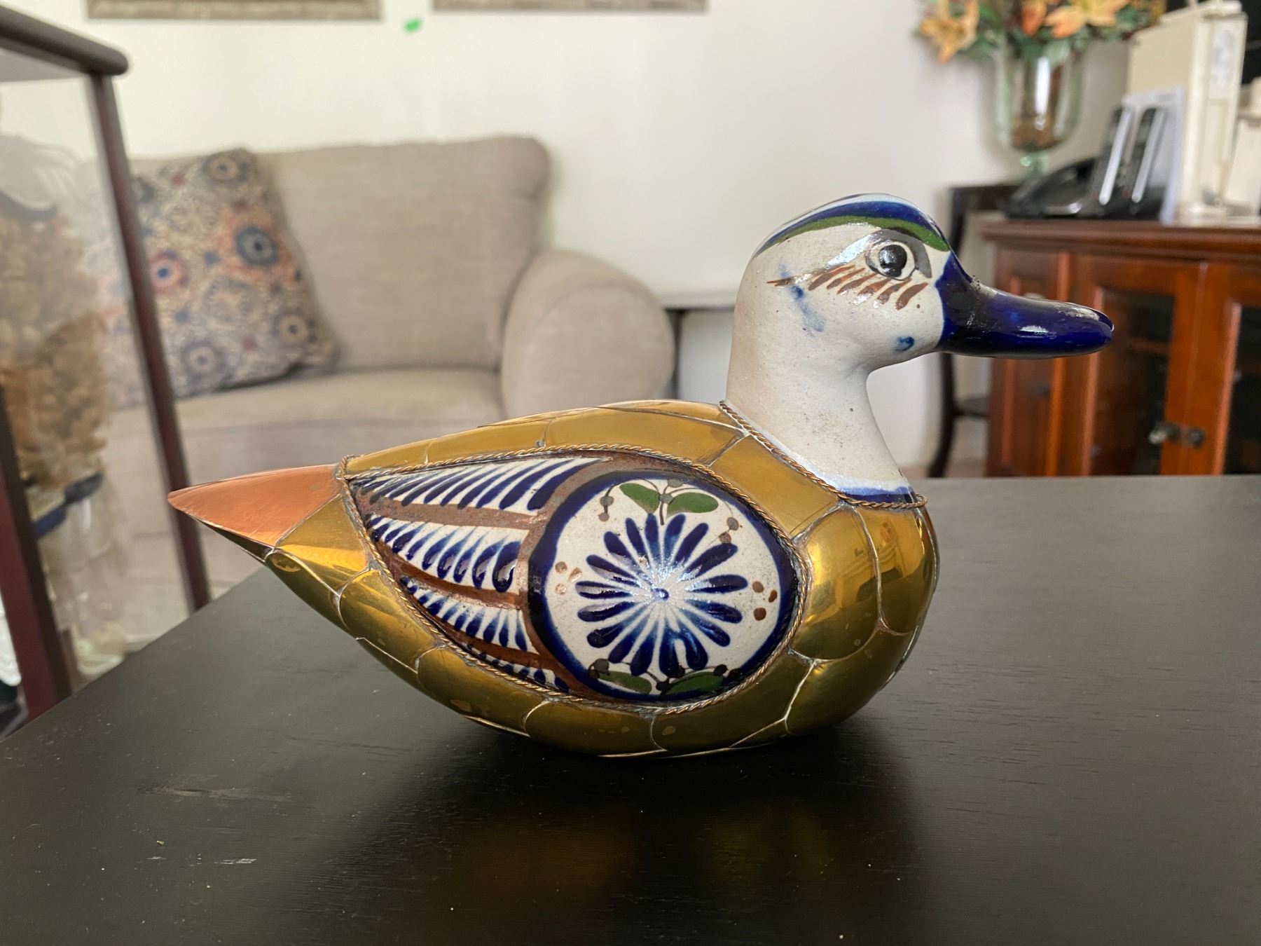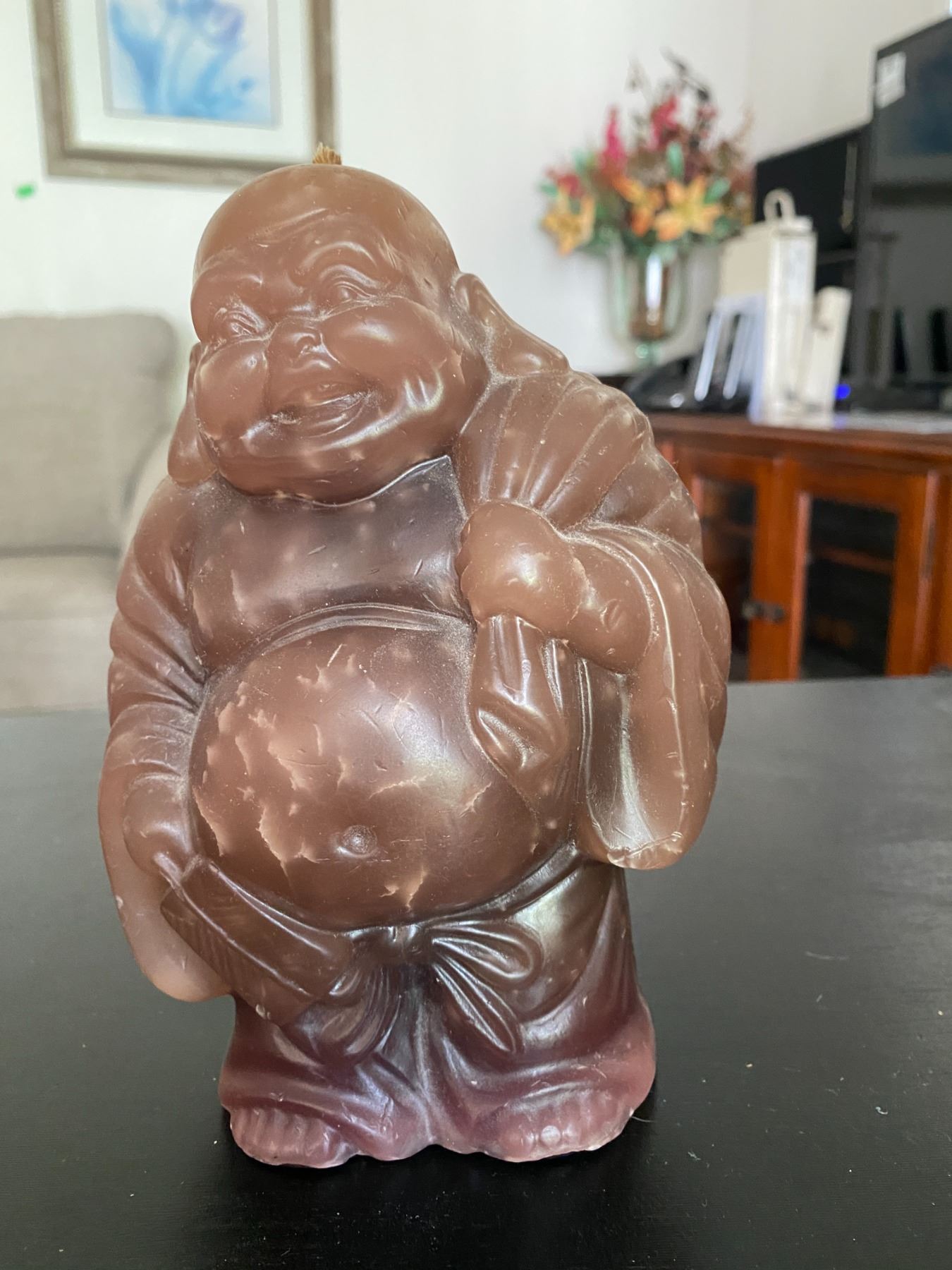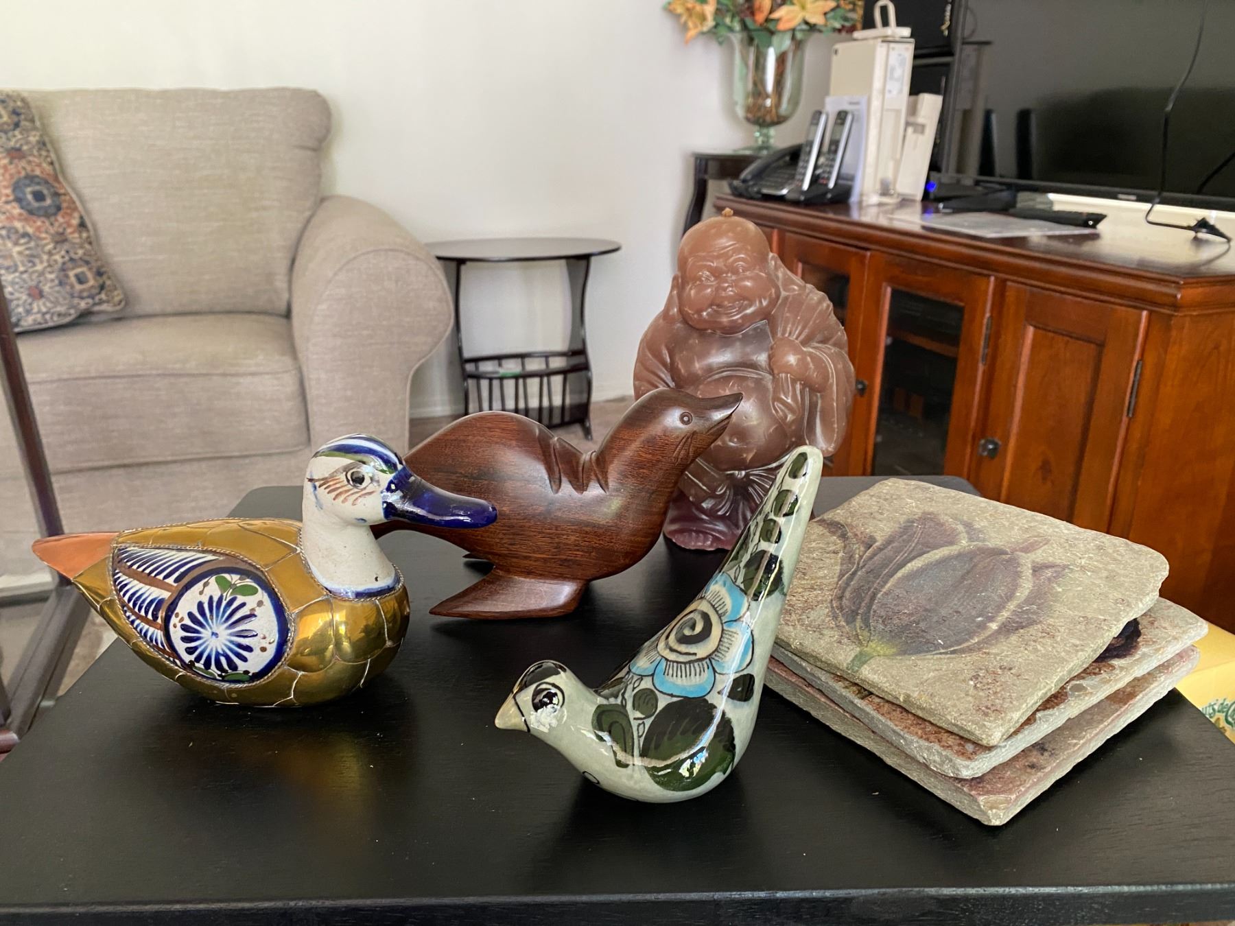 Buddha candle is 7" high. Brass detailed duck, wood sea lion, pottery bird, stone wall plaques.