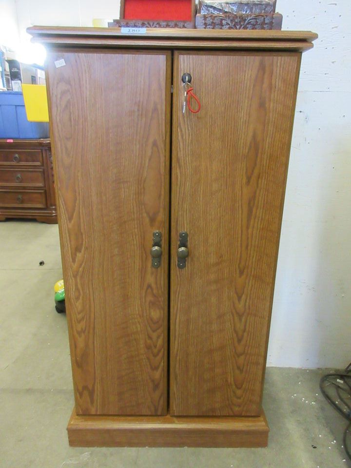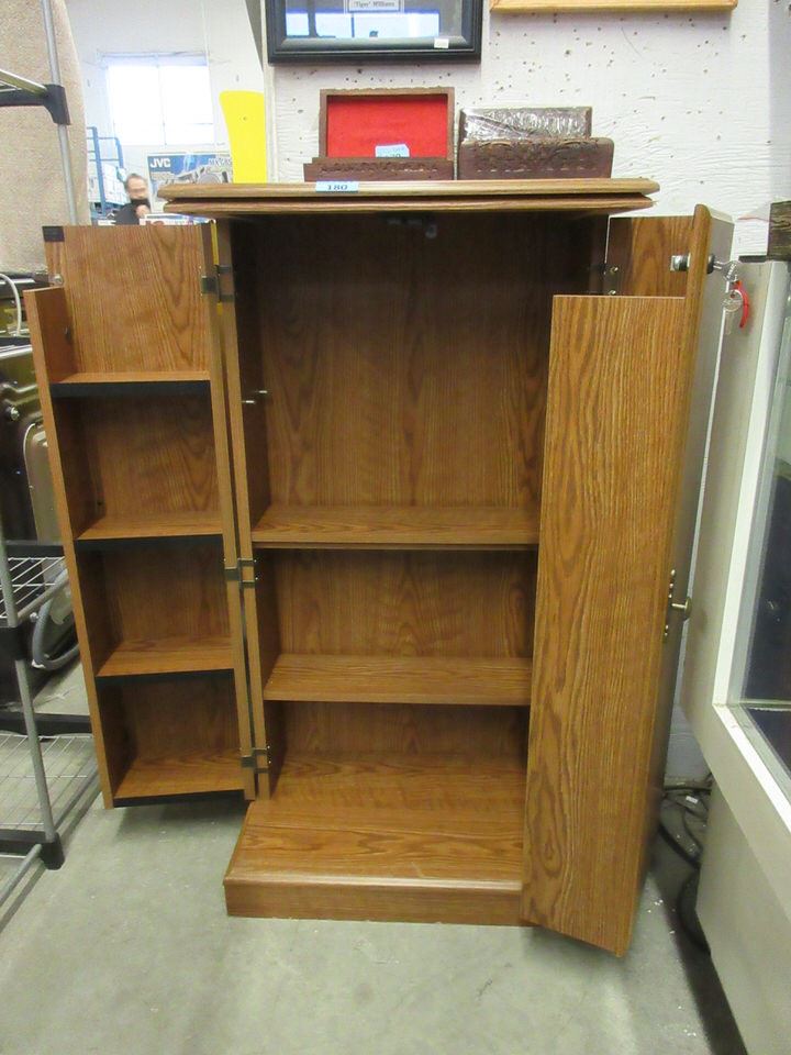 14" x 23" x 44" tall. Has interior shelves and shelves on doors.