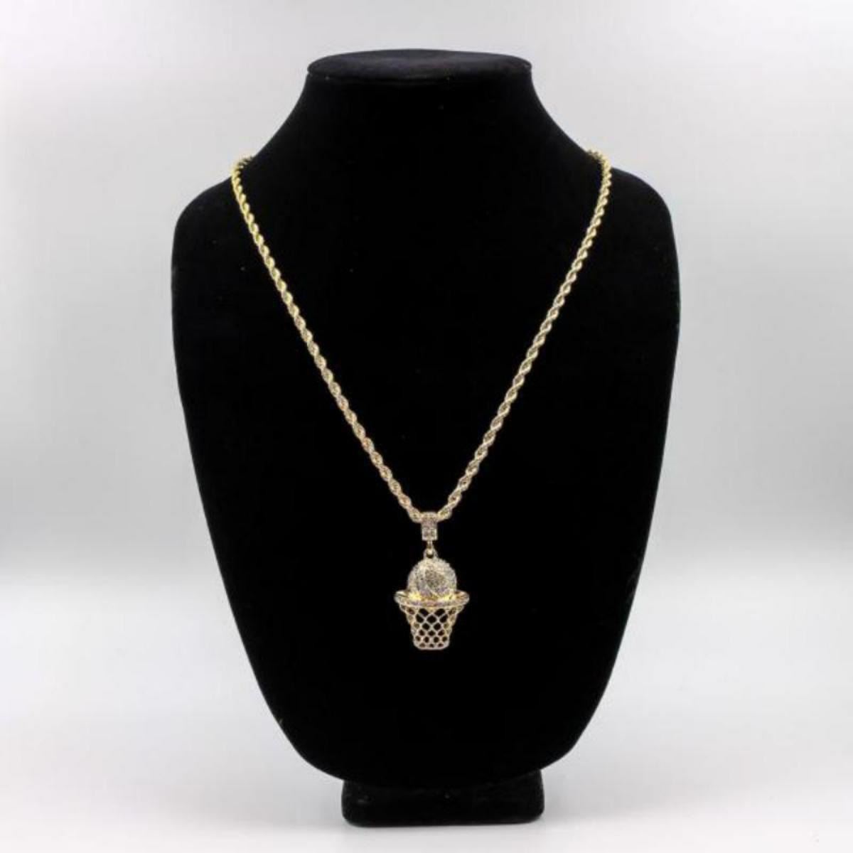 Awesome 14 Kt Gold Plated Basketball Hoop Pendant.This hoop pendant hangs from a 14 Kt Gold Plated 4mm 24 " rope chain. Looks like solid gold without the solid gold price.Approx 34.9 total gram wt. The chain and the pendant come together so really 2 items included together for just one price.Ready to wear now or anytime