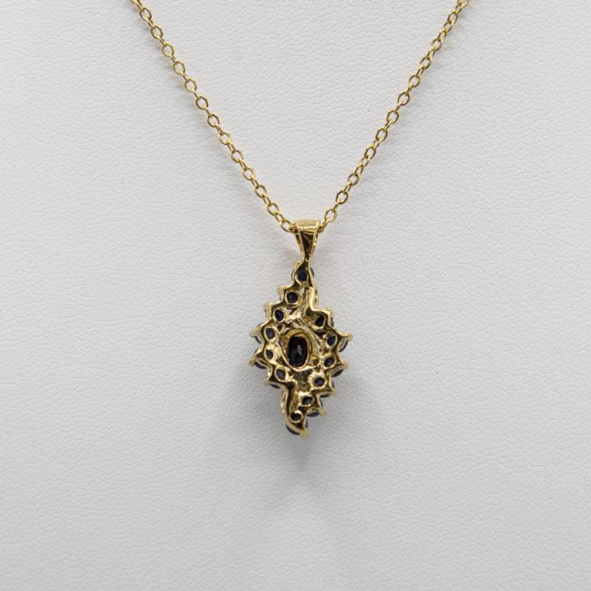 1.19 CT Sapphire & Diamond Designer Pendant.All Natural. No Treatments. The Blue Sapphire Center Stone Is A Faceted Oval Cut Measuring 5x3mm. This High End Sapphire Pendant Featurtes Twelve 2.5 mm. Faceted Round Cut Sapphires Accented By Two Pieces Of Genuine Brilliant Single Cut Diamonds. 0.02 carat Tw, I-J color & I2-I3 Clarity.All Gemstones Are Mounted In 18 Kt.Gold Overlay.4 Total Gram Wt. The length is 17 Inches.