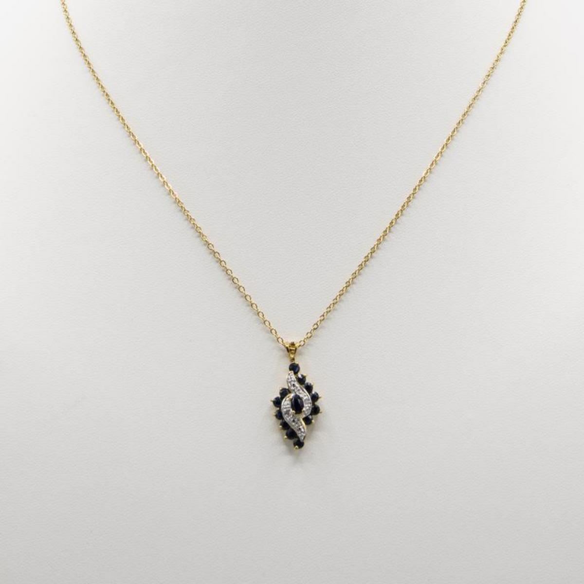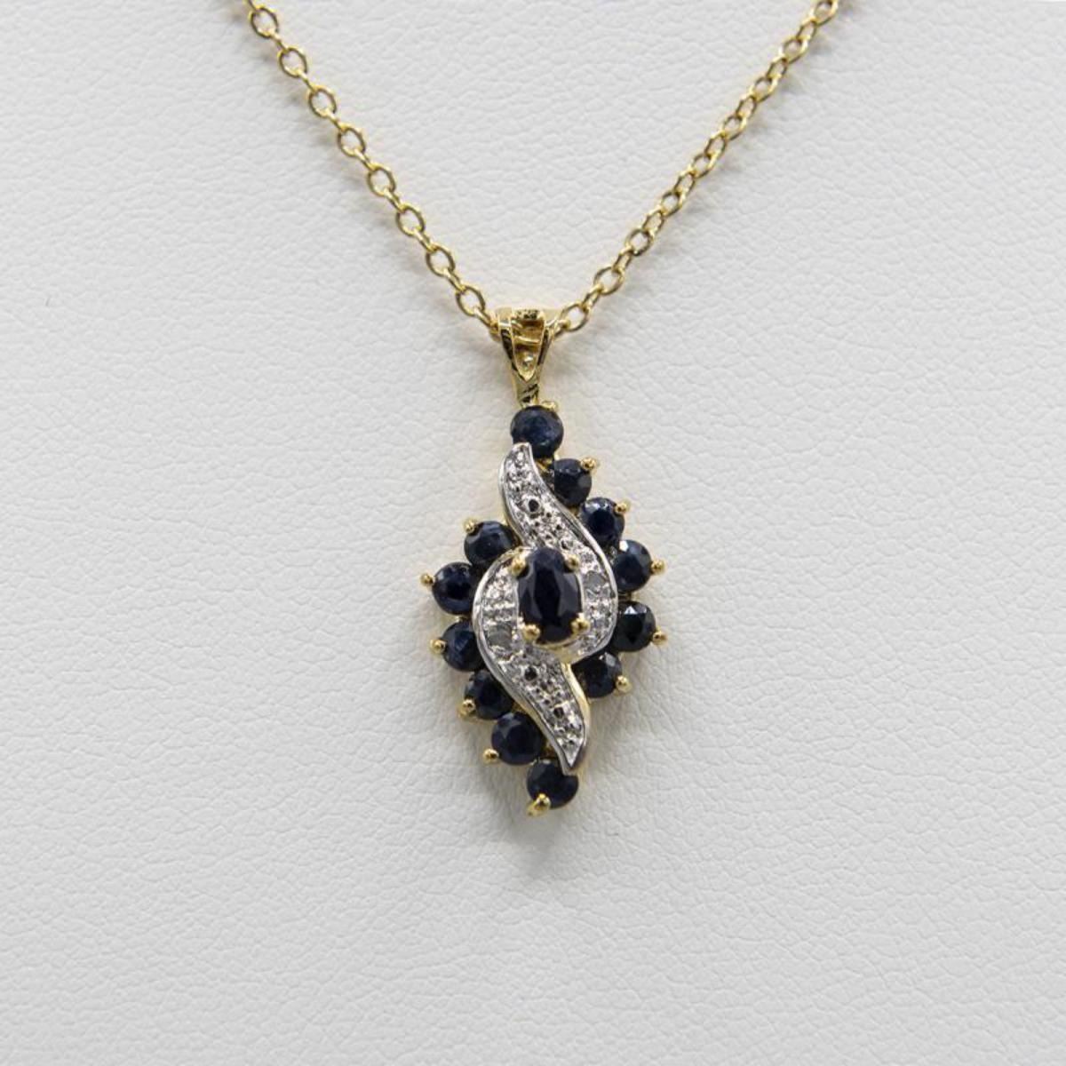 1.19 CT Sapphire & Diamond Designer Pendant.All Natural. No Treatments. The Blue Sapphire Center Stone Is A Faceted Oval Cut Measuring 5x3mm. This High End Sapphire Pendant Featurtes Twelve 2.5 mm. Faceted Round Cut Sapphires Accented By Two Pieces Of Genuine Brilliant Single Cut Diamonds. 0.02 carat Tw, I-J color & I2-I3 Clarity.All Gemstones Are Mounted In 18 Kt.Gold Overlay.4 Total Gram Wt. The length is 17 Inches.