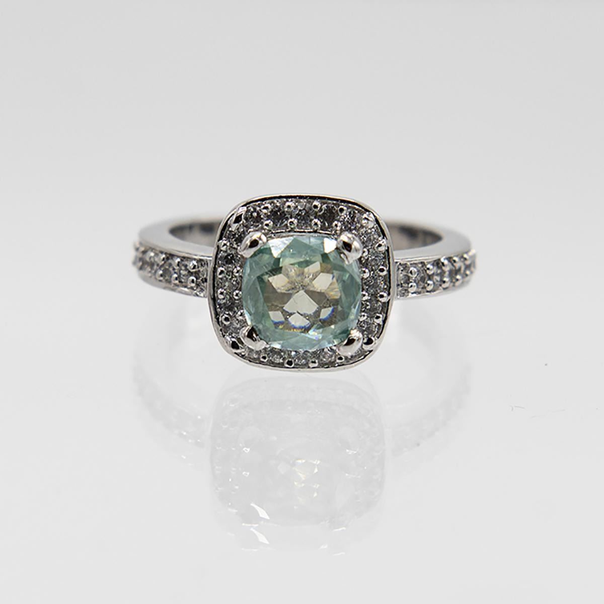 Stunning 3 Ct Emerald Green Colored Diamond Ring. This lab created diamond center stone is near flawless. It will test positive for a diamond on almost every single diamond tester. It is a cushion cut with cz accent stones. Mounted in solid .925 sterling silver complimented by rhodium which is a precious metal that is in the family of platinum. Rhodium overlay gives the silver a white gold shine polish and finish. It is also tarnish resistant. The ring is a size 7.5 Total gram wt. is approx.4.3 grams.