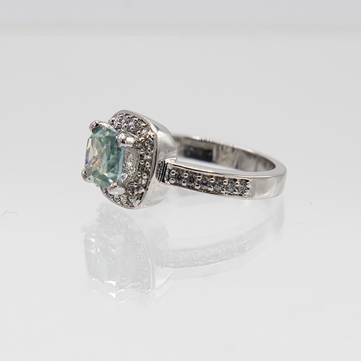 Stunning 3 Ct Emerald Green Colored Diamond Ring. This lab created diamond center stone is near flawless. It will test positive for a diamond on almost every single diamond tester. It is a cushion cut with cz accent stones. Mounted in solid .925 sterling silver complimented by rhodium which is a precious metal that is in the family of platinum. Rhodium overlay gives the silver a white gold shine polish and finish. It is also tarnish resistant. The ring is a size 7.5 Total gram wt. is approx.4.3 grams.