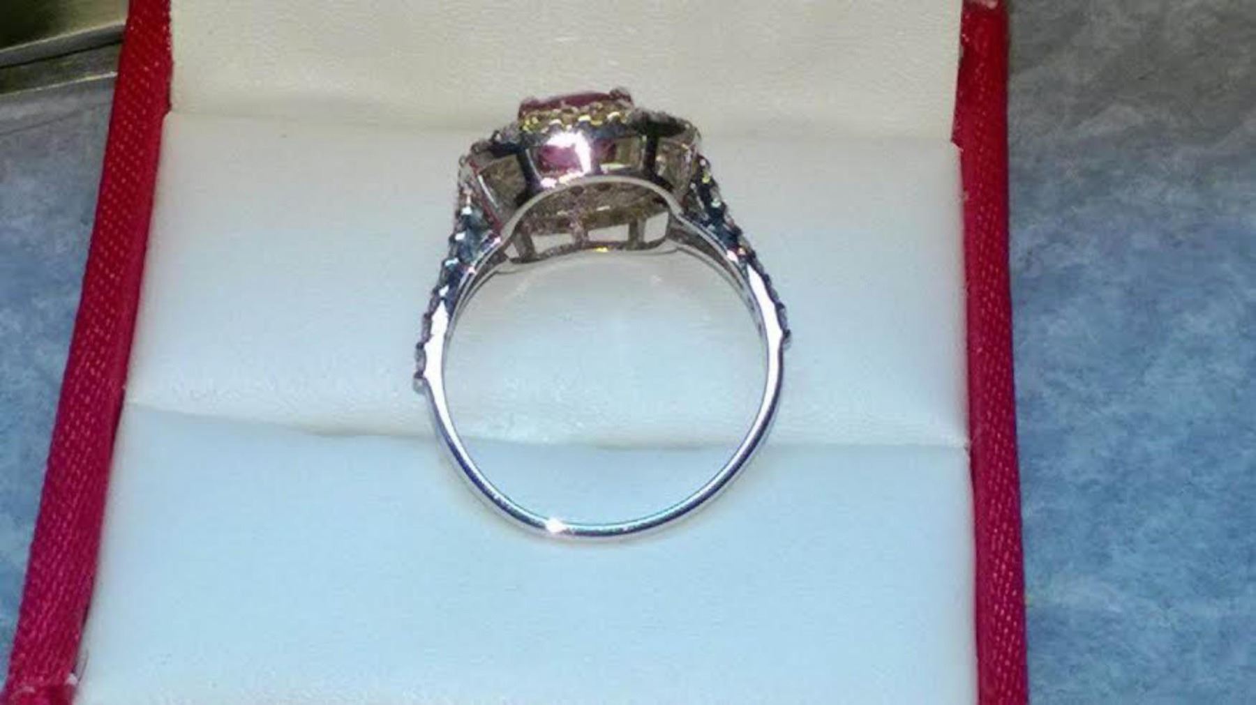 Stunning Kashmir Sapphire Diamond & Gold Ring - GRS certified. 14k white gold 3.5 grams...size 6.5 (can be resized); Natural Diamonds 1.27 carats...G/H-SI...COMPLETELY natural untreated; Natural Kashmir Pink Sapphire 1.22 carats....Dimensions: 6.3 x 5.7 x 3.5 mm; This stone shows a large 1 1/2 ct face with a 62% depth. The Kashmir mine produced stones in a range of color from purple to pink to ruby red. The material displays a strong color shift from the more red (incandescent) to more purple (fluorsecent) spectrum. This photo was taken in fluorescent white light displaying more pink/purple. We cut this stone from the rough. The stone is bright and lively without significant inclusions.