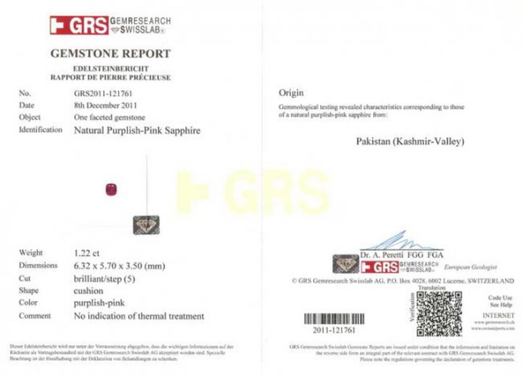 Stunning Kashmir Sapphire Diamond & Gold Ring - GRS certified. 14k white gold 3.5 grams...size 6.5 (can be resized); Natural Diamonds 1.27 carats...G/H-SI...COMPLETELY natural untreated; Natural Kashmir Pink Sapphire 1.22 carats....Dimensions: 6.3 x 5.7 x 3.5 mm; This stone shows a large 1 1/2 ct face with a 62% depth. The Kashmir mine produced stones in a range of color from purple to pink to ruby red. The material displays a strong color shift from the more red (incandescent) to more purple (fluorsecent) spectrum. This photo was taken in fluorescent white light displaying more pink/purple. We cut this stone from the rough. The stone is bright and lively without significant inclusions.