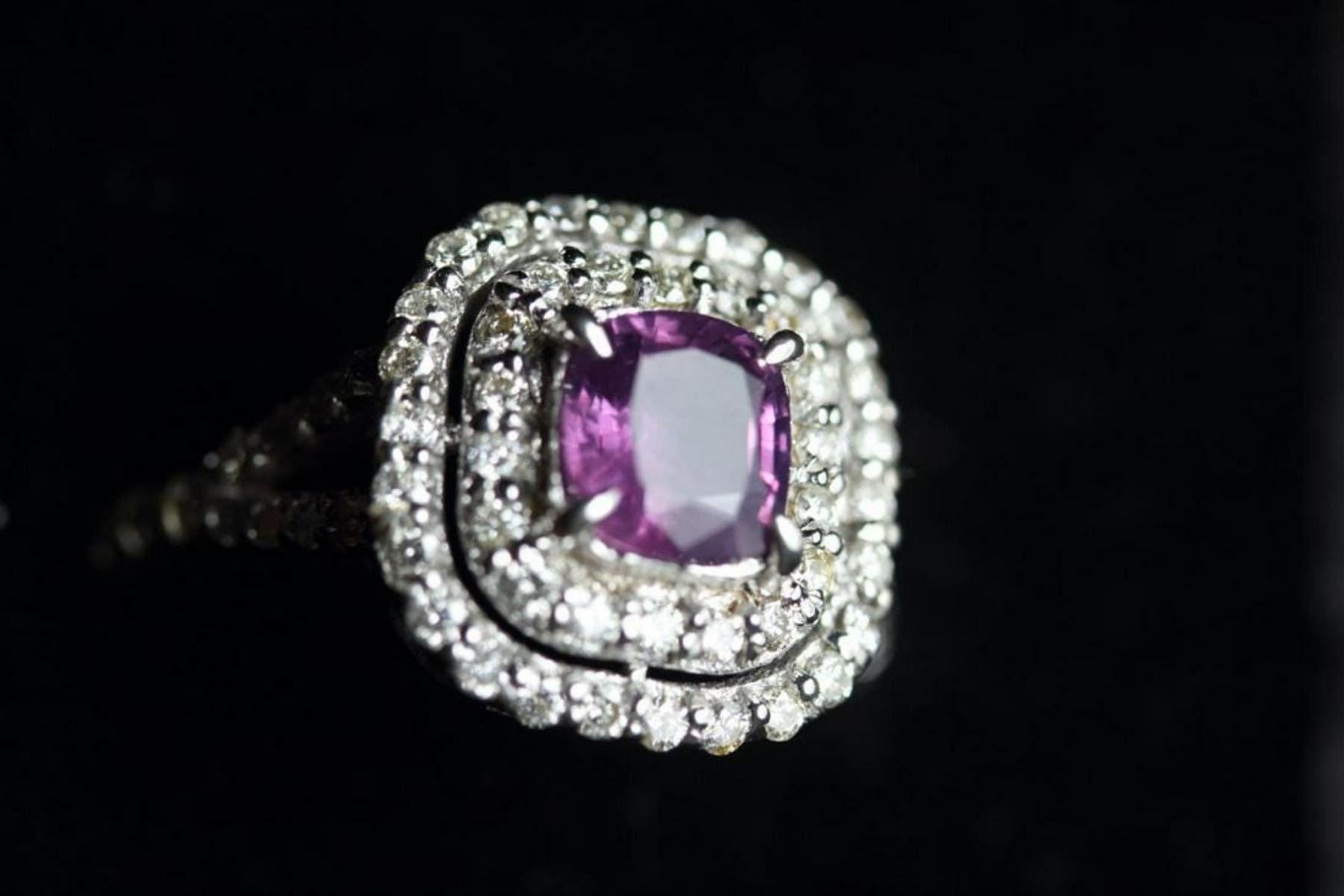 Stunning Kashmir Sapphire Diamond & Gold Ring - GRS certified. 14k white gold 3.5 grams...size 6.5 (can be resized); Natural Diamonds 1.27 carats...G/H-SI...COMPLETELY natural untreated; Natural Kashmir Pink Sapphire 1.22 carats....Dimensions: 6.3 x 5.7 x 3.5 mm; This stone shows a large 1 1/2 ct face with a 62% depth. The Kashmir mine produced stones in a range of color from purple to pink to ruby red. The material displays a strong color shift from the more red (incandescent) to more purple (fluorsecent) spectrum. This photo was taken in fluorescent white light displaying more pink/purple. We cut this stone from the rough. The stone is bright and lively without significant inclusions.