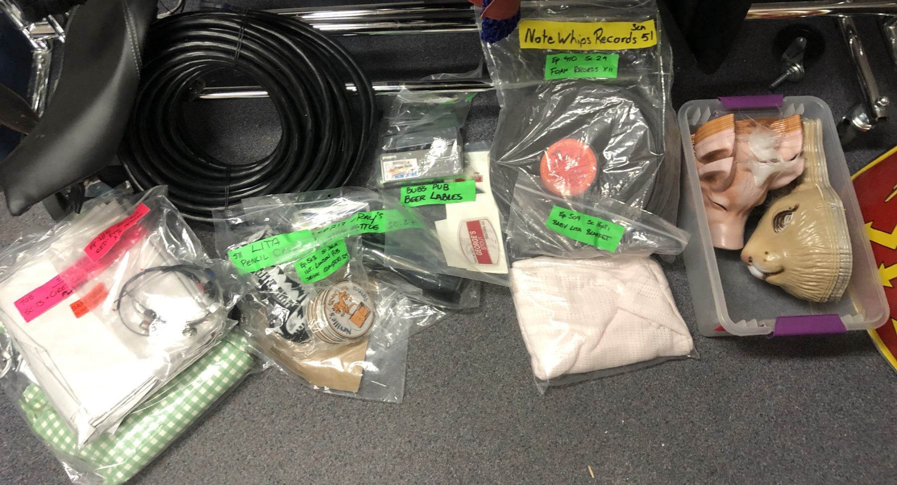 "Superhero Show" Large group of assorted set dec items - includes extension card/pig and rabbits masks/prop foam records/grey coffin/pub drink coasters/red eye glasses etc.