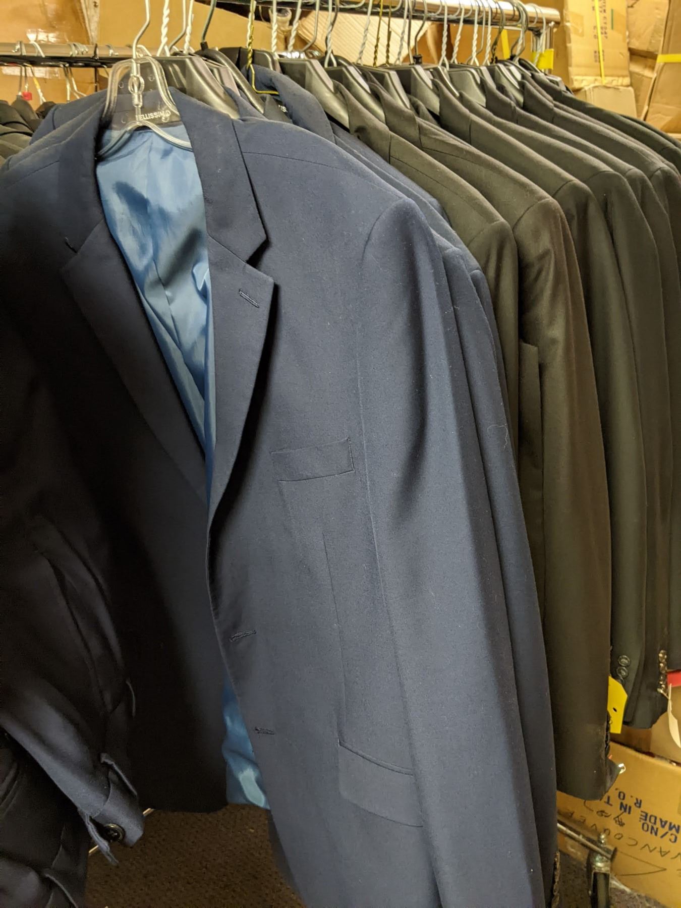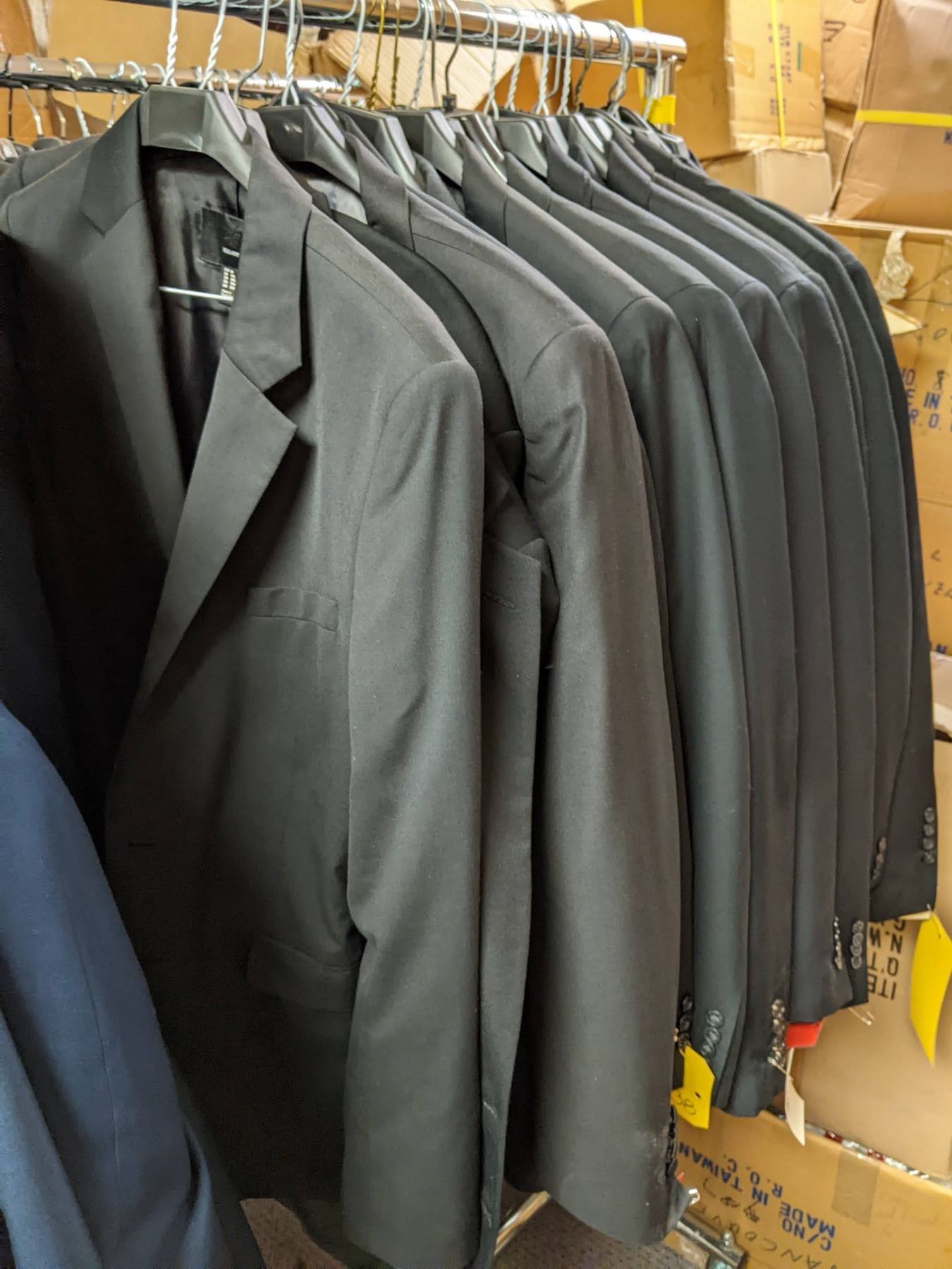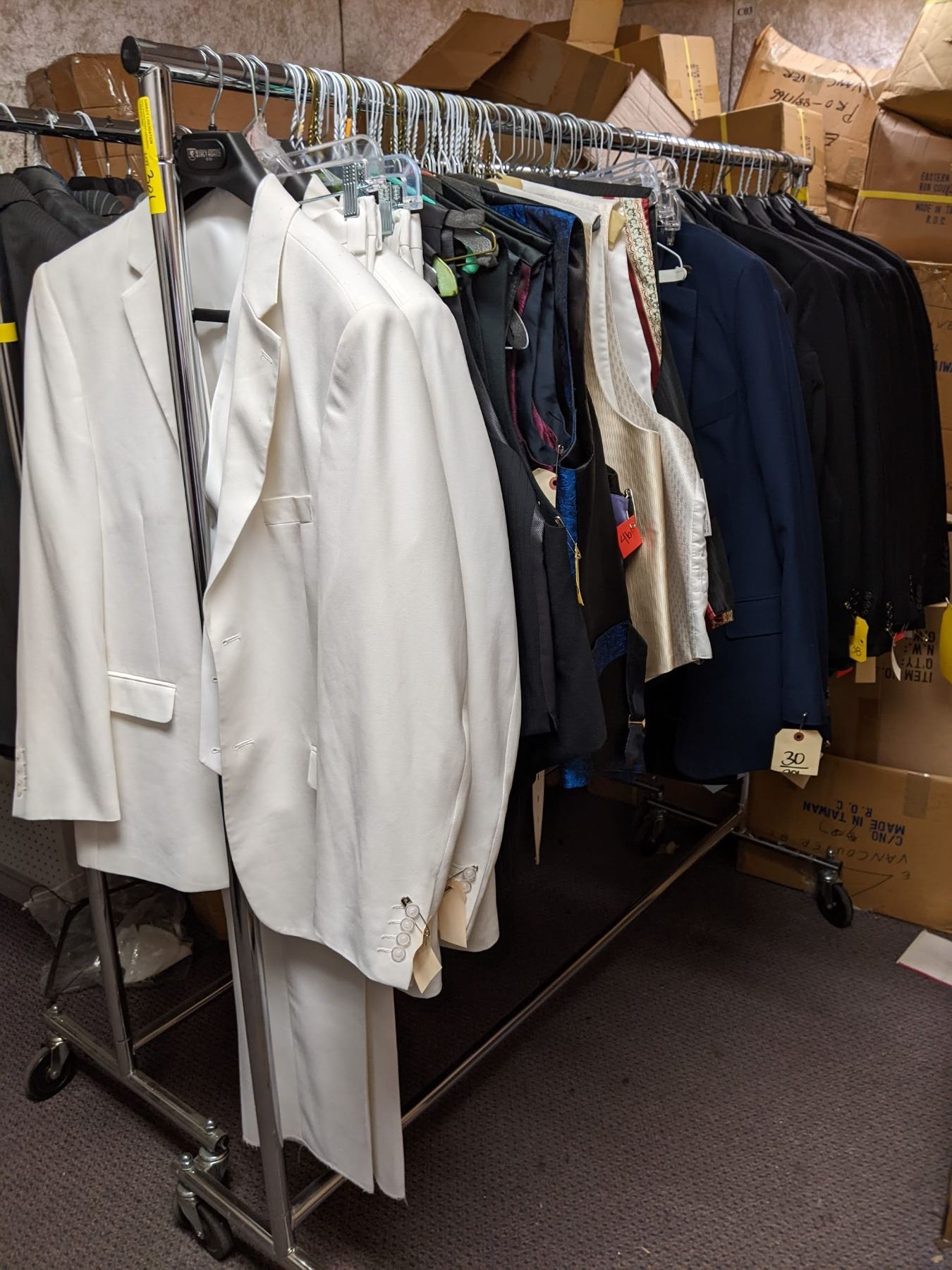 "Superhero Show" - Rack of assorted screen worn wardrobe - includes black suit jackets/vests/navy dress pants/ 2 white suit jackets & pants etc. - approx. 70 pcs *Rack not Included*