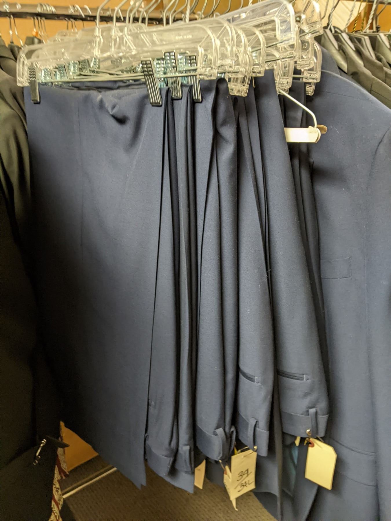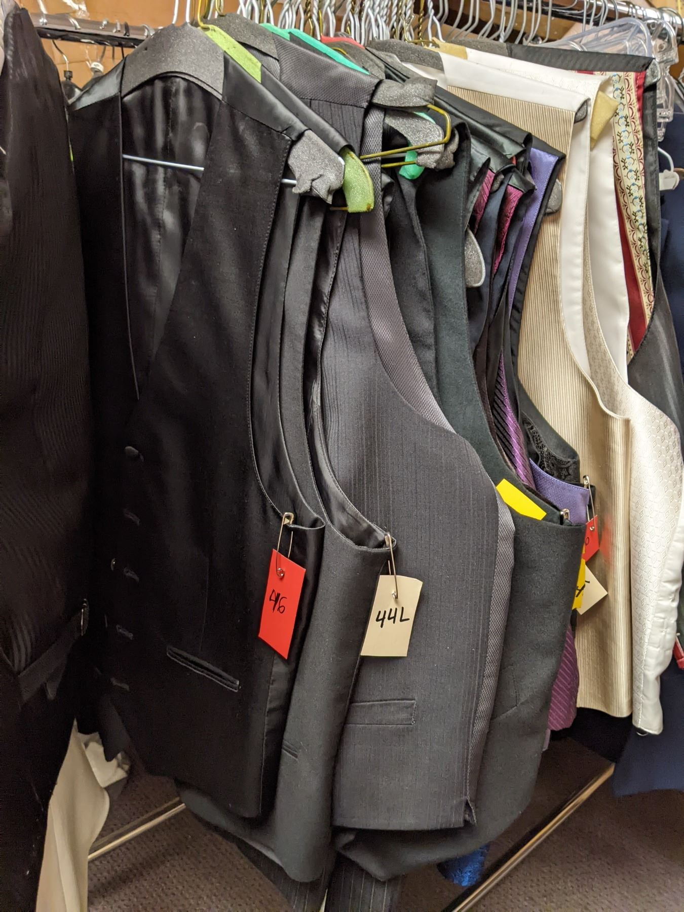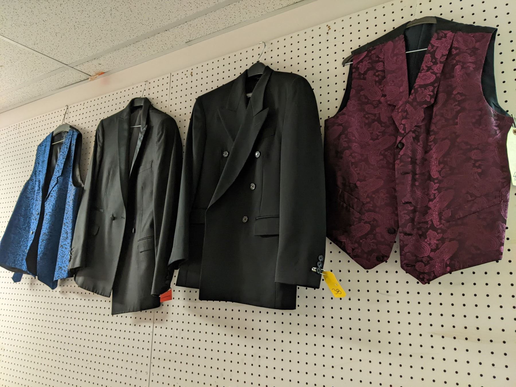 "Superhero Show" - Rack of assorted screen worn wardrobe - includes black suit jackets/vests/navy dress pants/ 2 white suit jackets & pants etc. - approx. 70 pcs *Rack not Included*