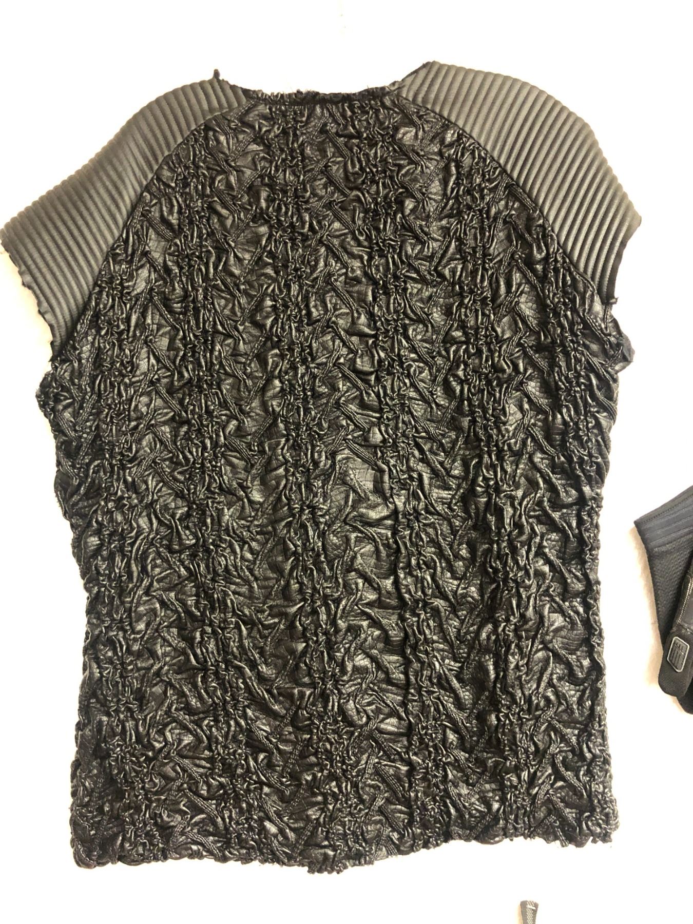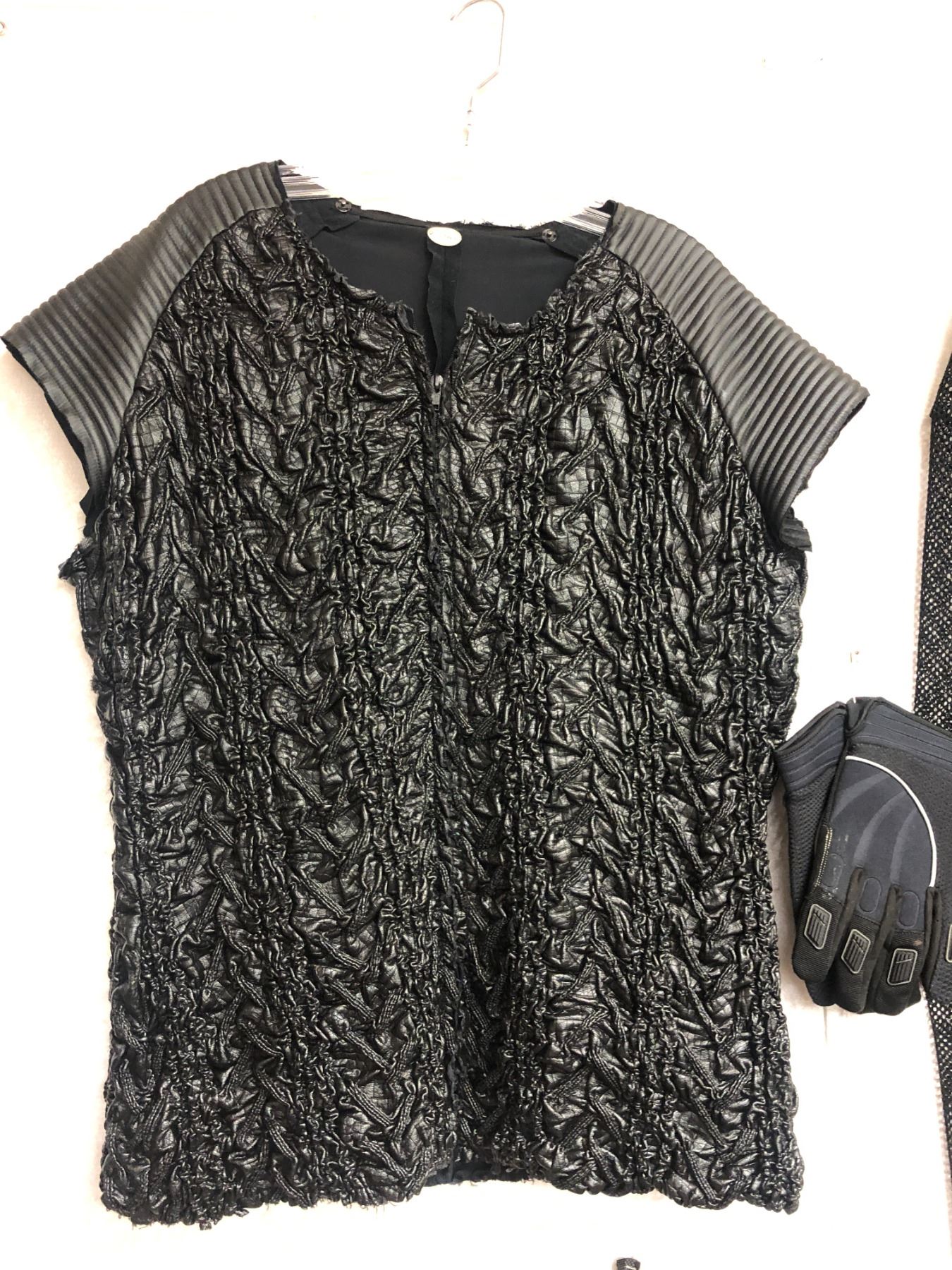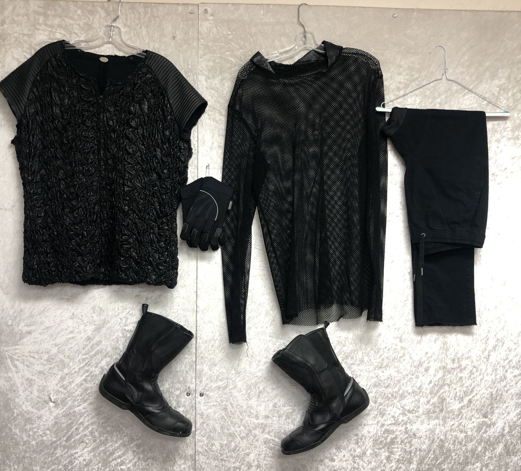 "Superhero Show - Season 4 Ep. 8"- #60 Hero - Complete 'Demon' outfit - includes MTO black smocked leather vest w/quilted leather shoulder panels/MTO black mesh long sleeve shirt/Zanerobe black joggers (size: 36)/Hipora tall leather futuristic boots (size:13) & Dakota black gloves - *HOTSTOCK*