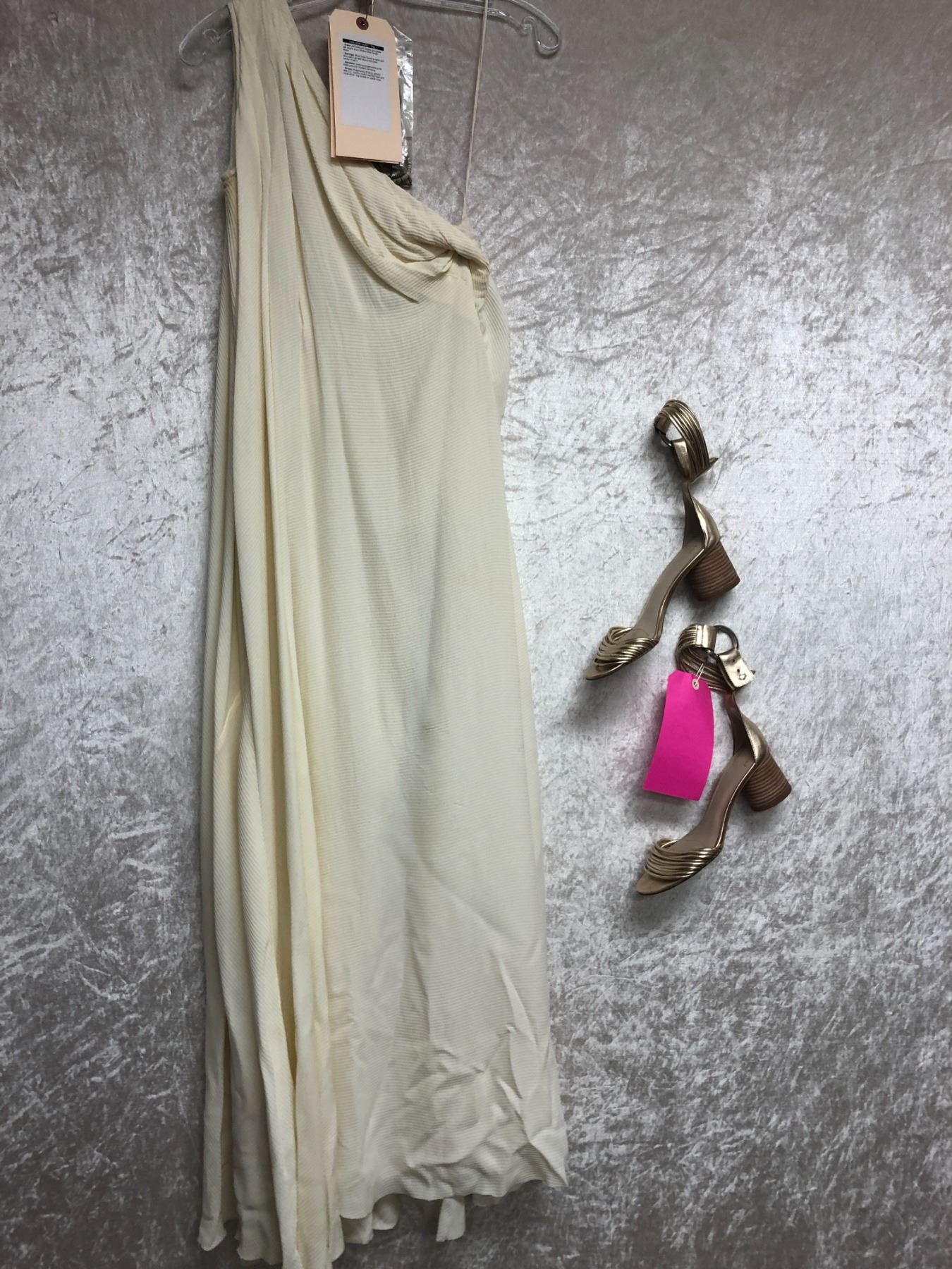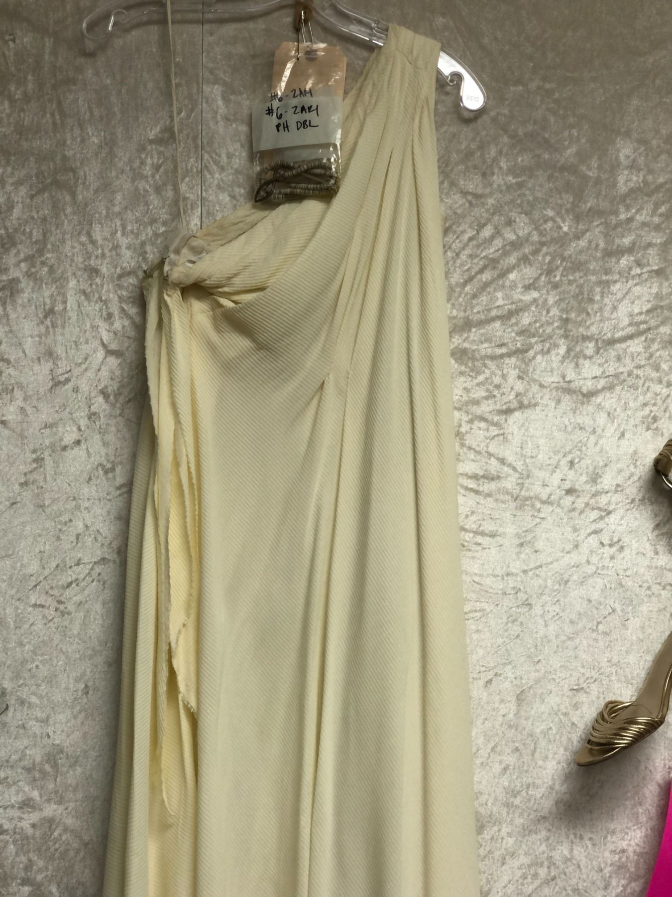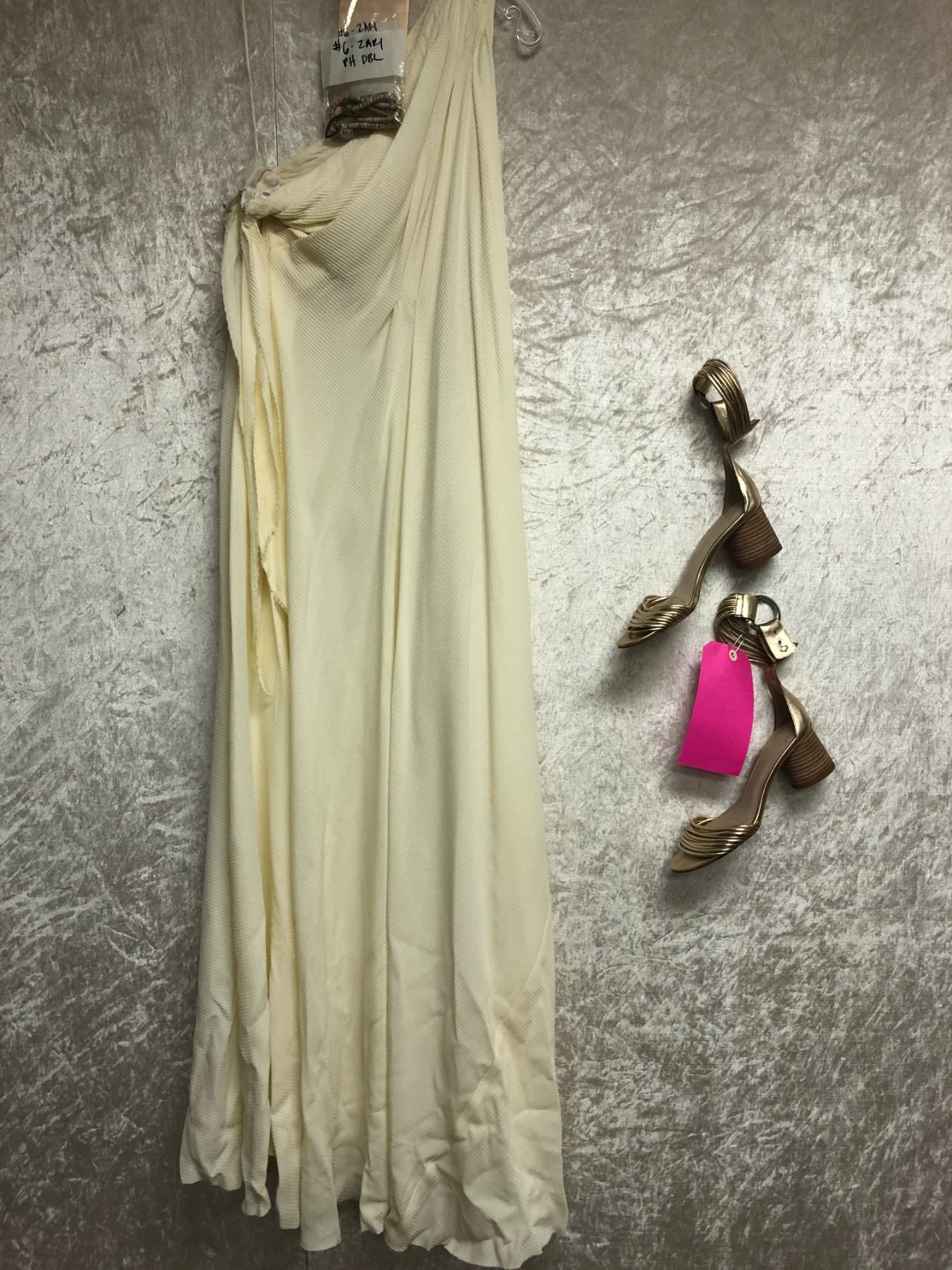 "Superhero Show" - Season 5 Ep. 10- #106 Hero Stunt - Complete vintage-looking outfit - includes dress (MTO - white)/shoes (Paige - gold) & necklace (Anthropologie - multicolor beaded)