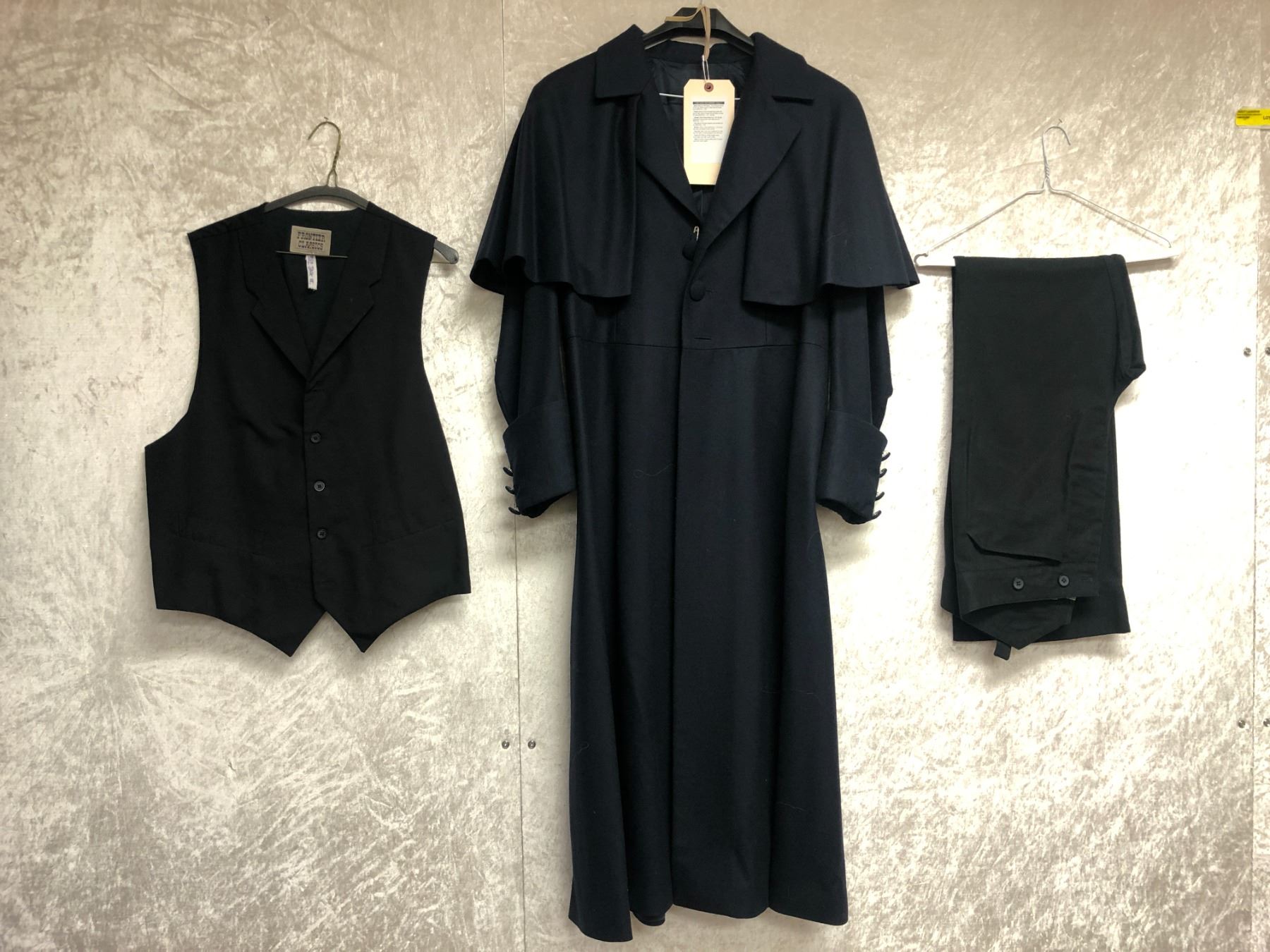 "Superhero Show" - Season 5 Ep. 10- #52 Hero - 3 pc 'Ripper' outfit - includes MTO Navy ankle length wool inverness coat/ Frontier classics black vest (size:M) & black pants - *HOTSTOCK*