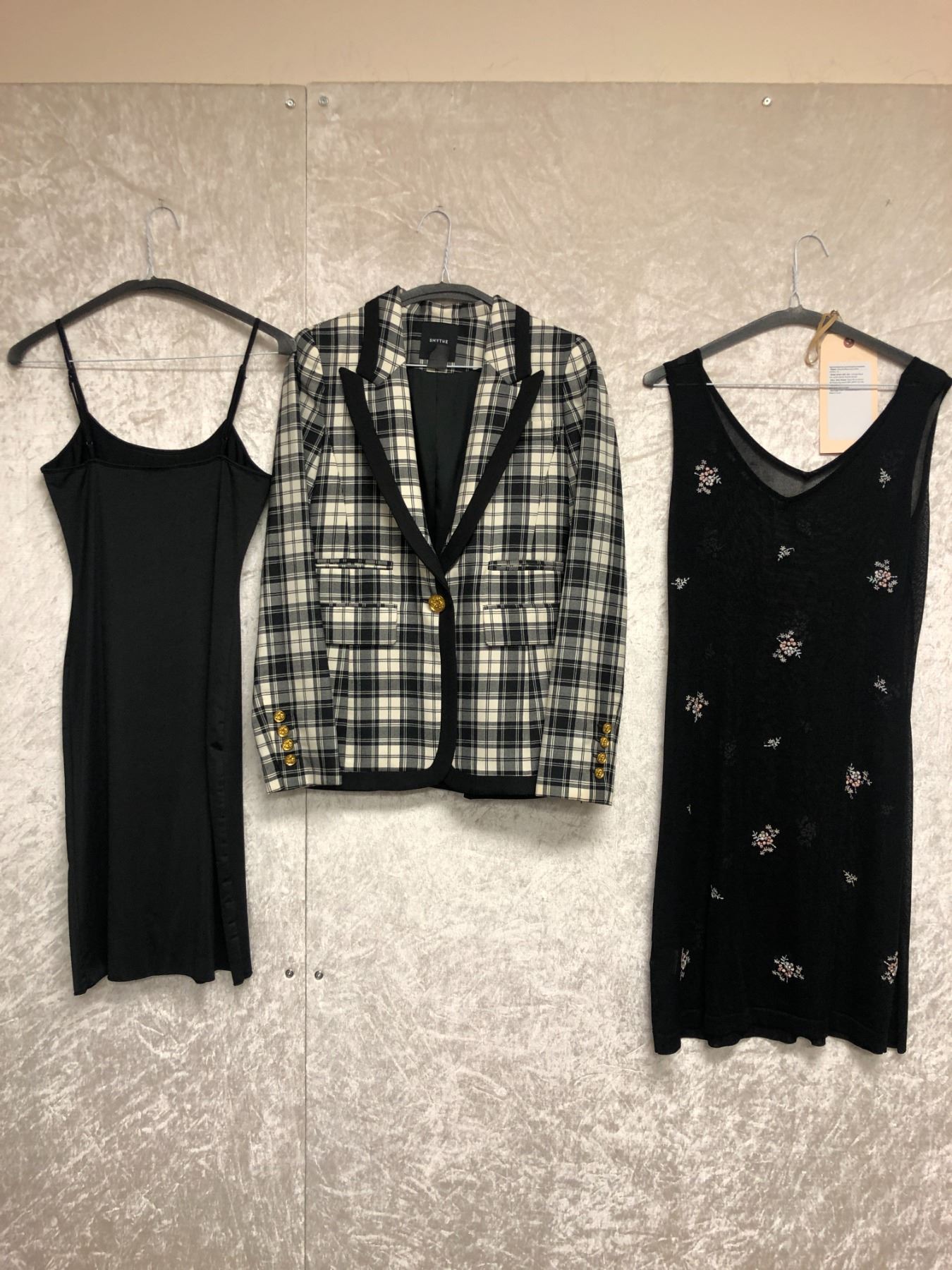 "Superhero Show - Season 5 Ep. 14"- #6 Hero - Complete 'UB Montage' outfit - includes Smythe black and white plaid blazer (size:4) & Vintage black w/embroidered flower sheer dress w/slip (size:S) - *HOTSTOCK*