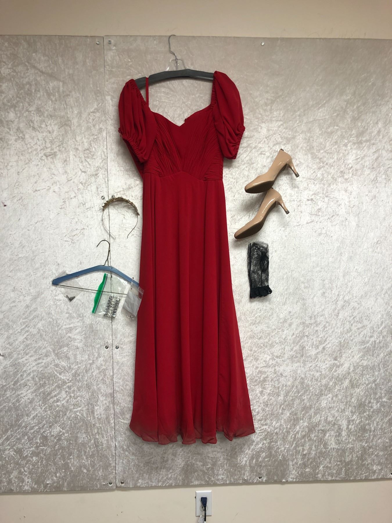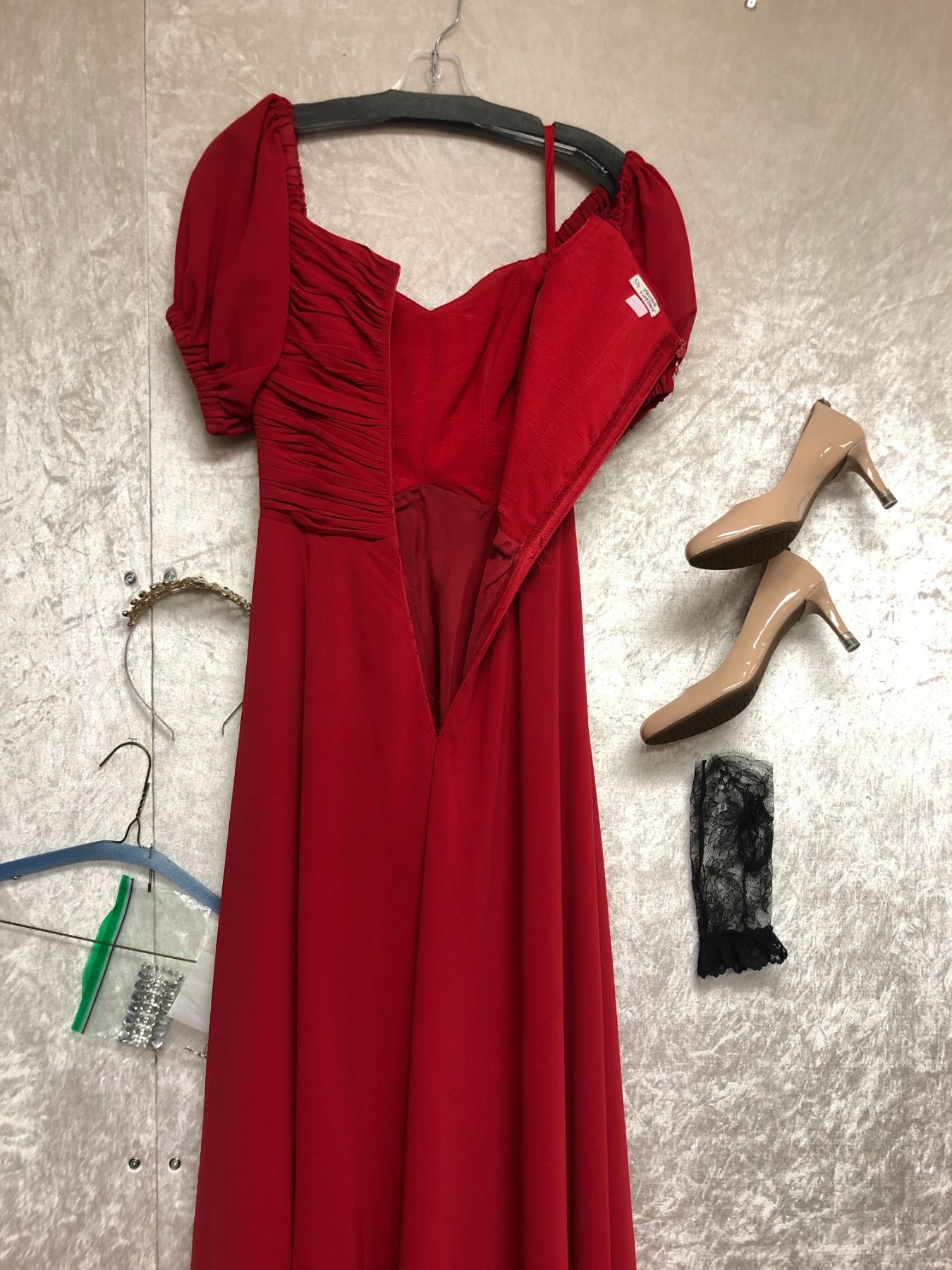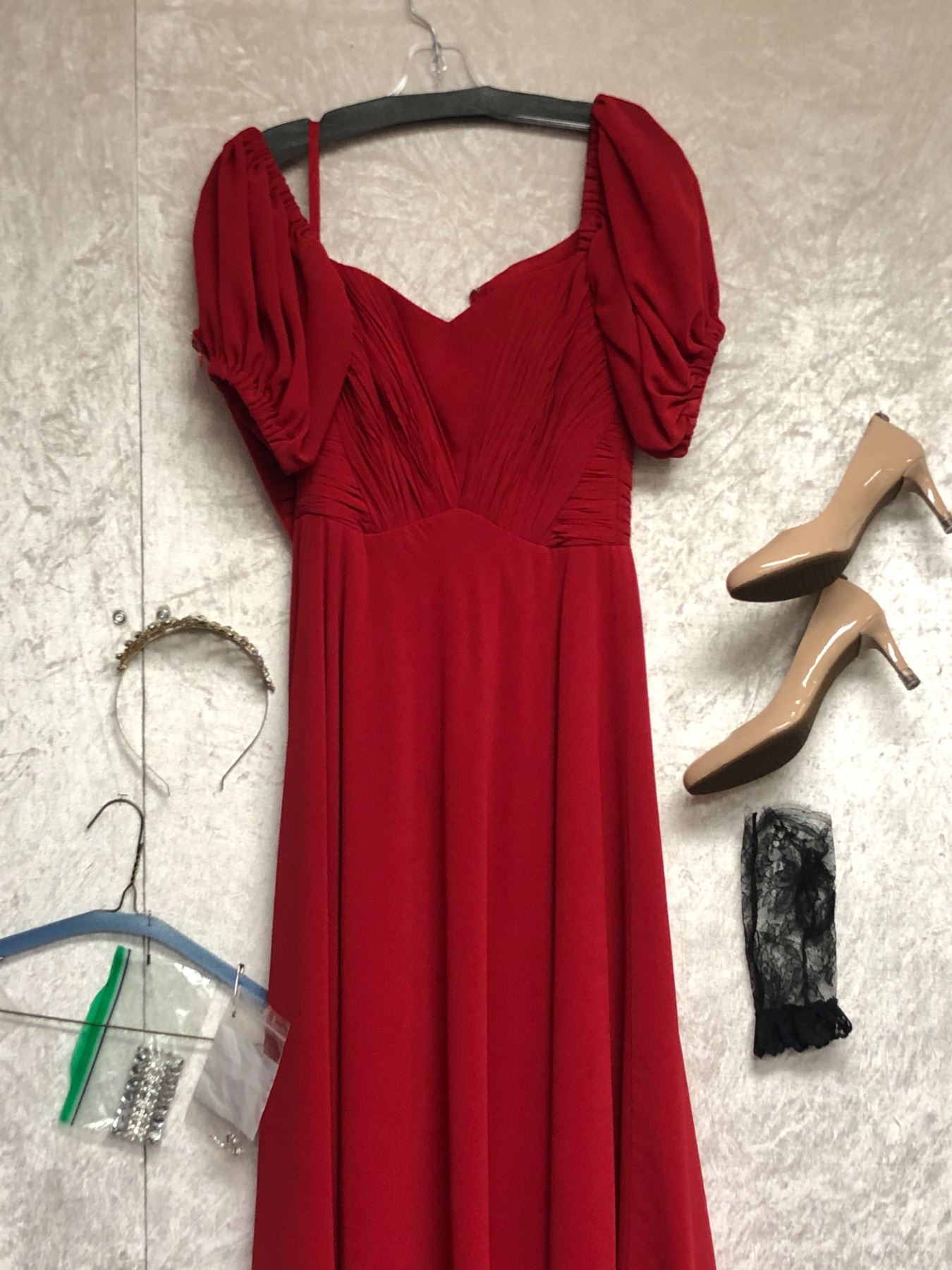 "Superhero Show - Season 5 Ep. 3"- #54 Hero - Complete 'Prom' outfit - includes dress (MTO - red)/shoes (Michael Kors - nude - size:7)/Silver Tiara/Silver bracelet (wide stretchy jeweled)/ Le Chateau necklace & earrings - *HOTSTOCK*