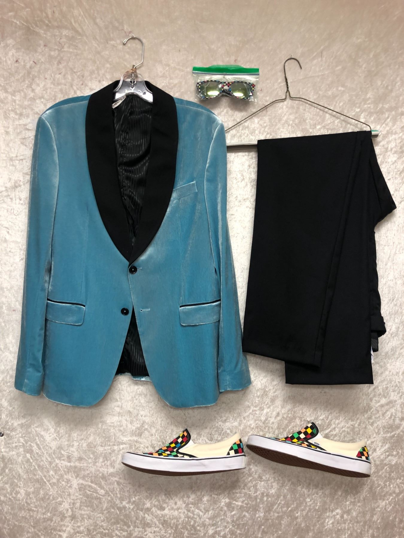 "Superhero Show - Season 5 Ep. 3" - #61 Hero - 1989 DJ outfit - includes Jacket(Zara men - Lt. blue/black - Size: 40)/pants (Calvin Klein - black - Size:34)/Shoes (Vans - multicolor - Size:13) & Sunglasses (Vans - multicolor) - *HOTSTOCK*