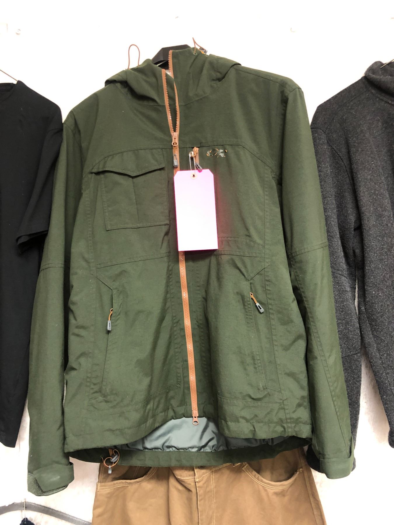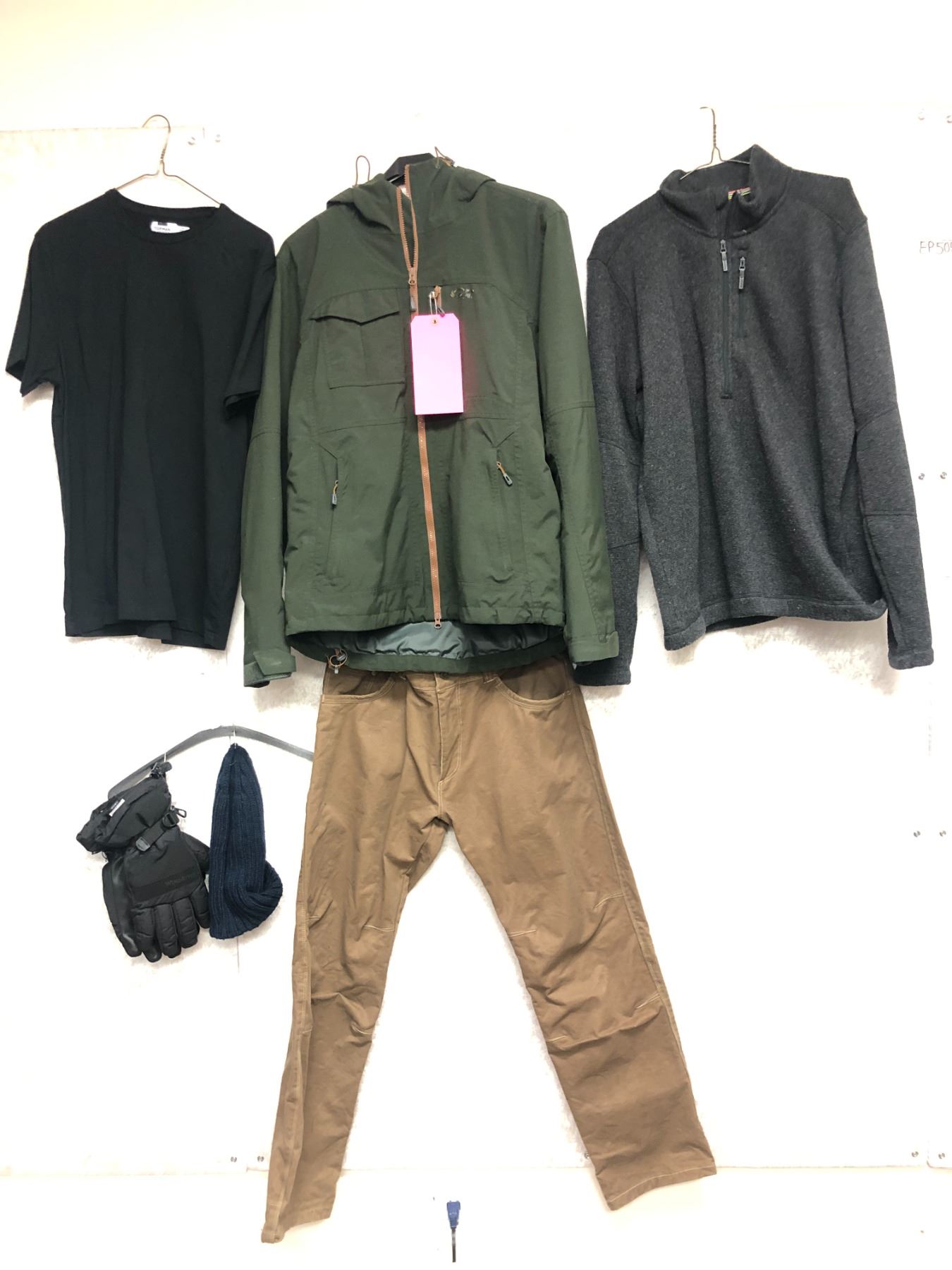 "Superhero Show - Season 6 Ep. 11"- #3 Hero - 6 pc set of Camping outfit - includes coat (Outdoor Research - Green - size:L)/fleece (Smartwool - charcoal - size:L)/pants (Kuhl - brown - size: 34 x 30)/T-shirt (Topman - black - size:M)/Toque (Core - Navy - OS) & Gloves (WindRiver - black - size:XL) - *HOTSTOCK*