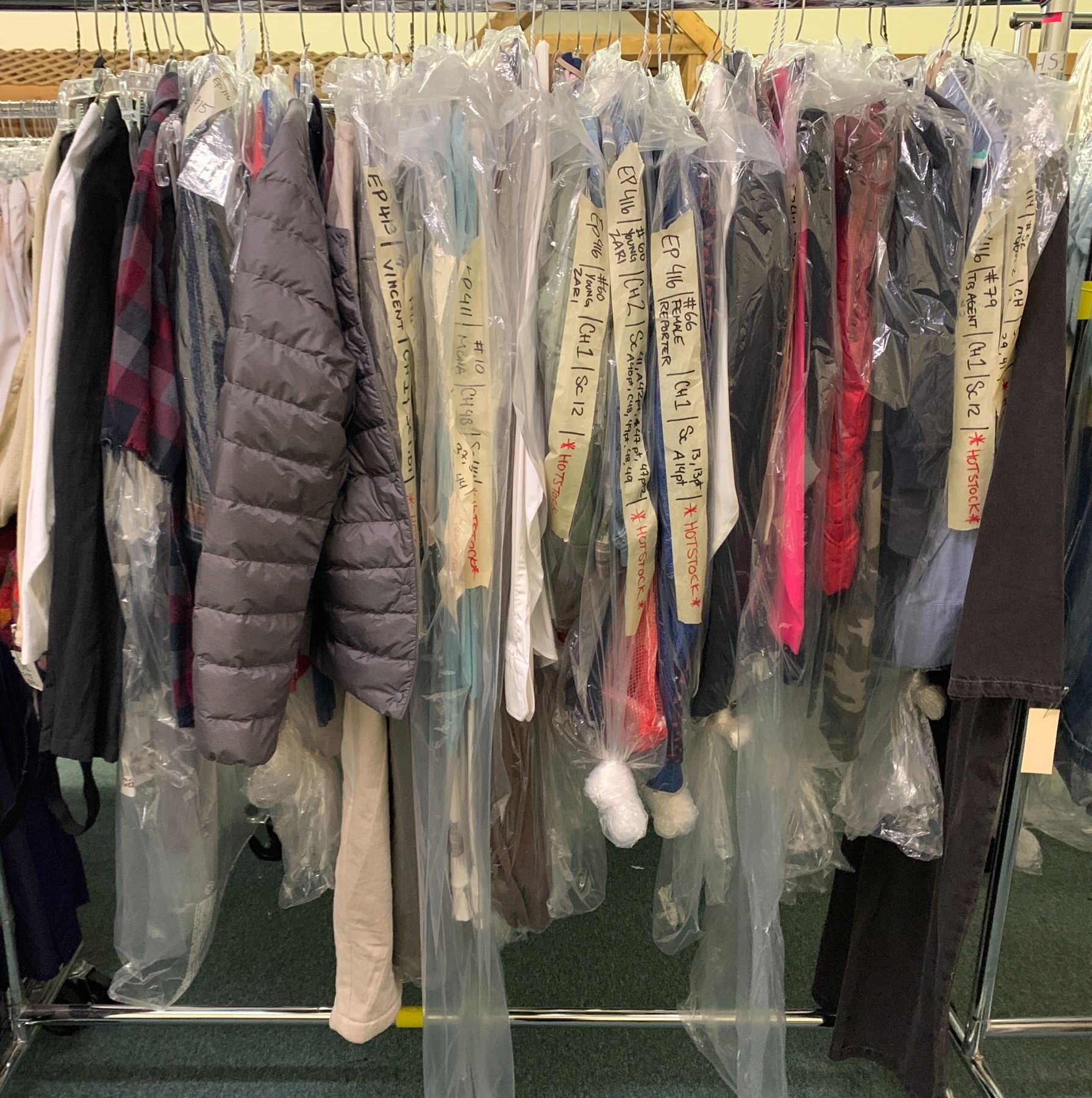 "Superhero Show" rack of assorted screen worn wardrobe - includes complete outfits / vintage looking clothing / kids clothing (approx 55 pcs)