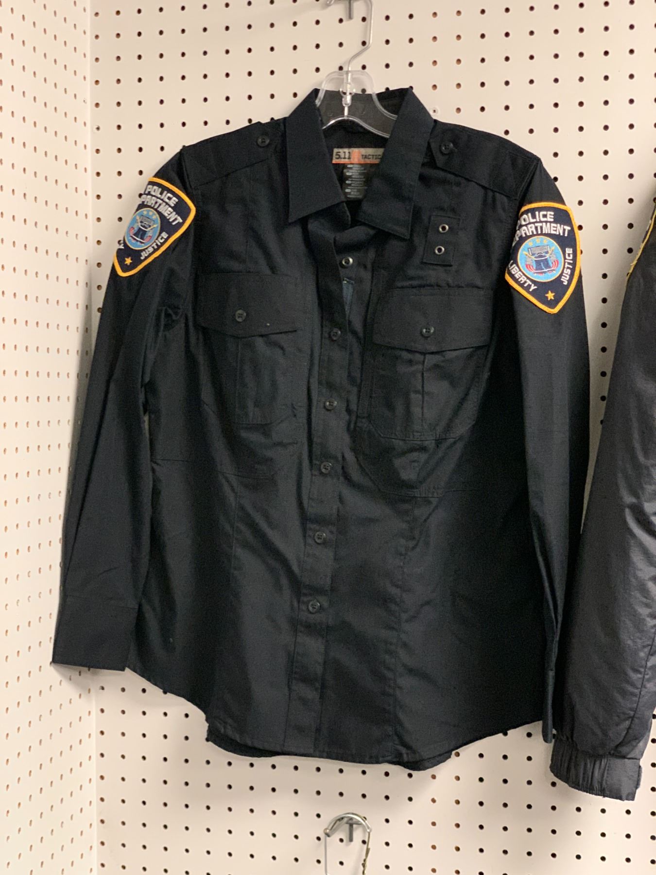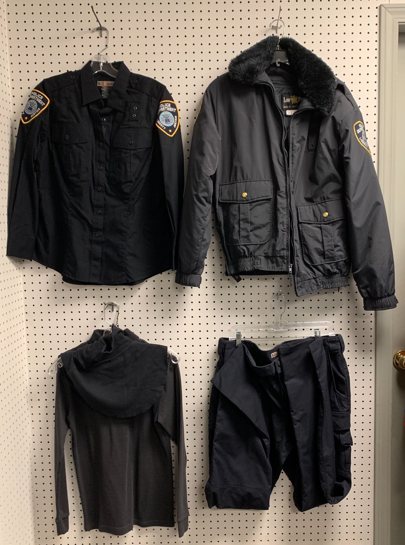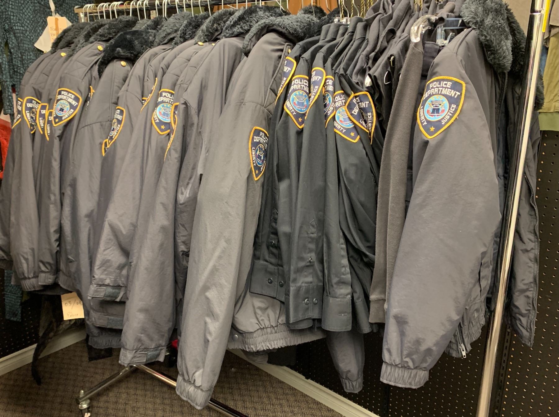 "Superheroes Show" - Rack full of Police Department Liberty Justice uniform jackets & shirts (approx. 40 pcs.)