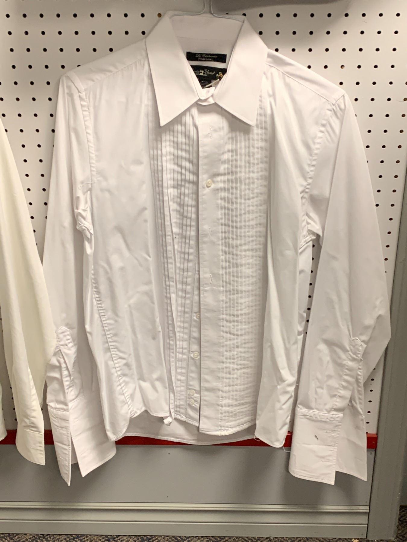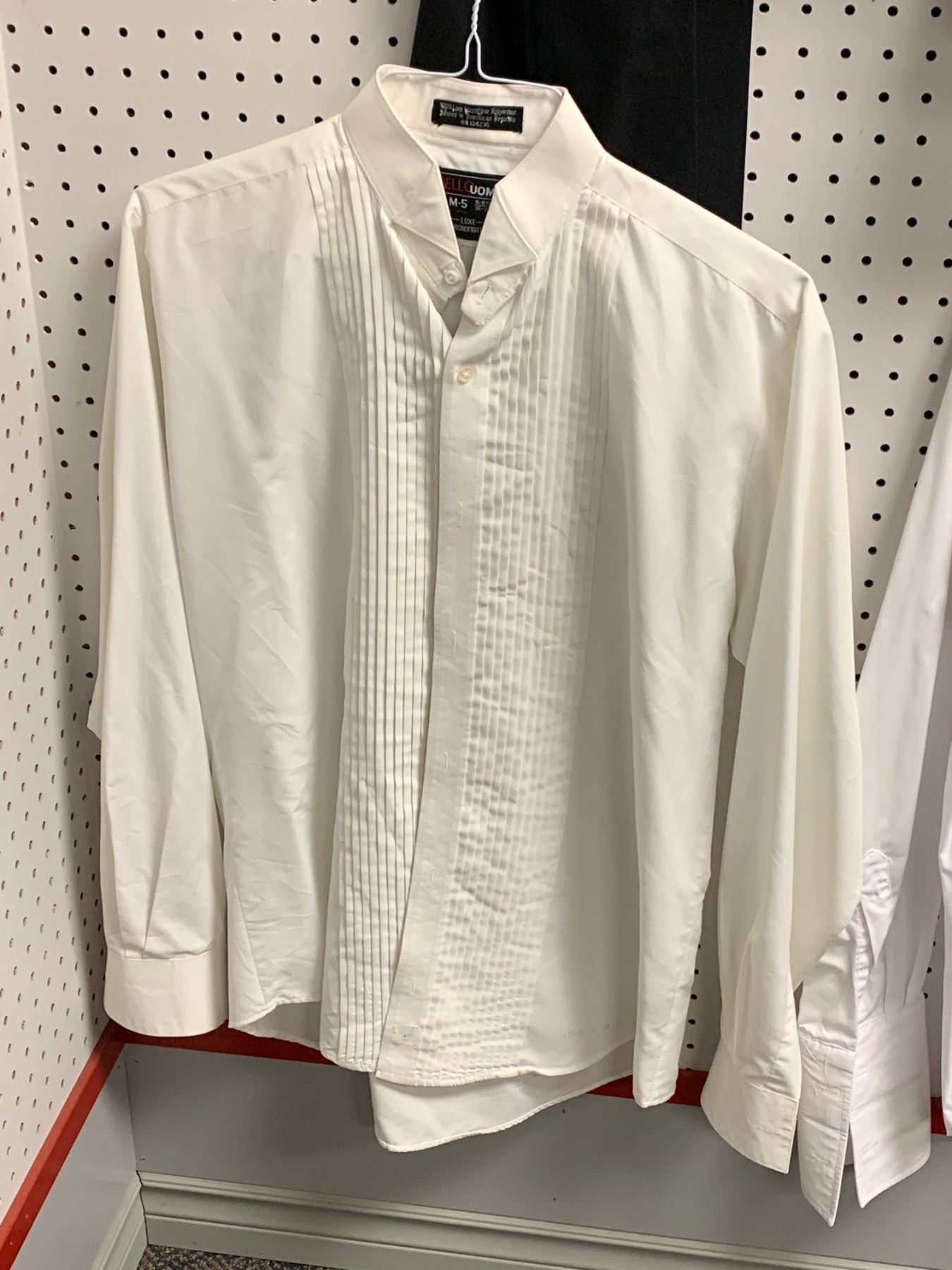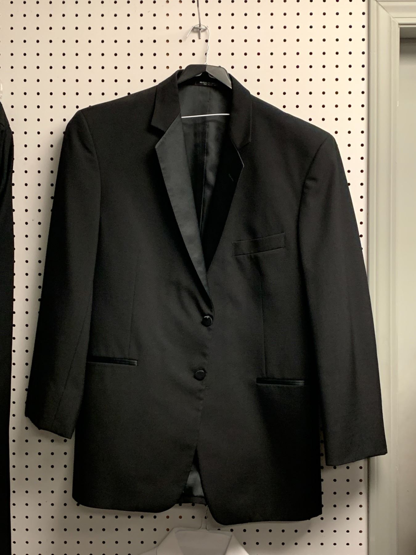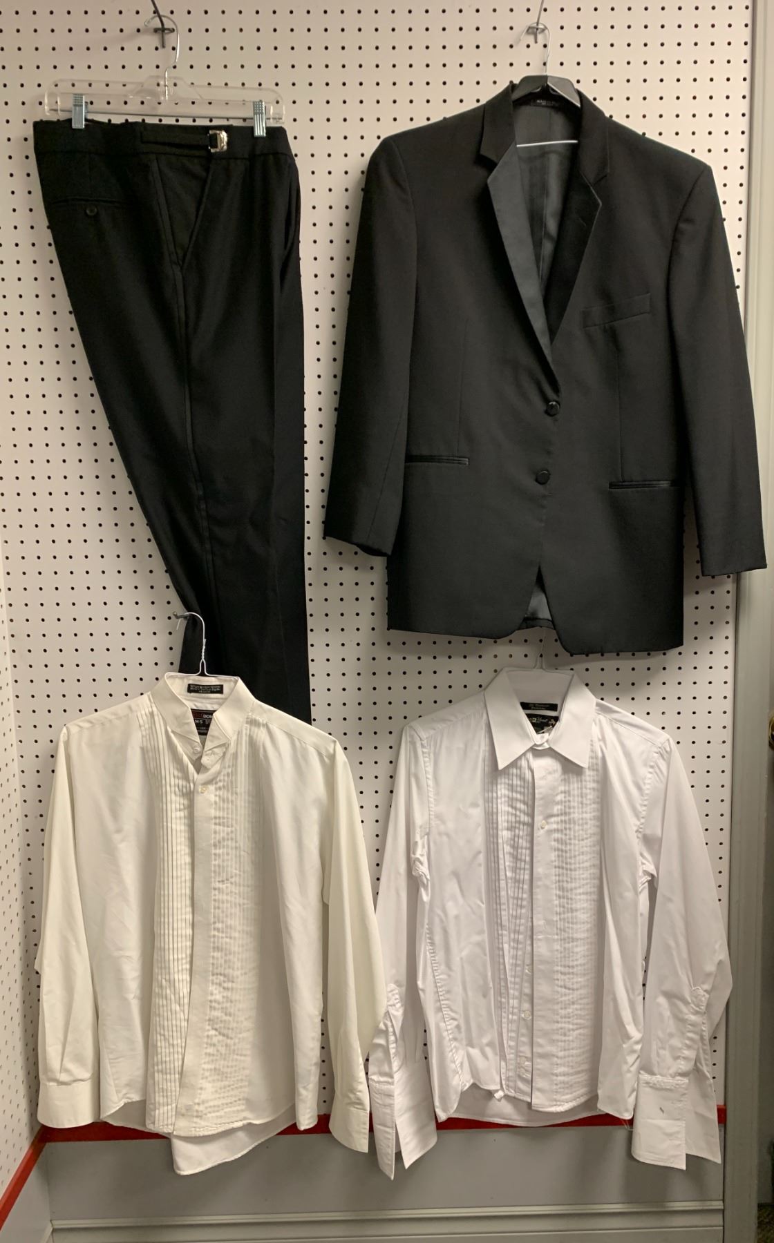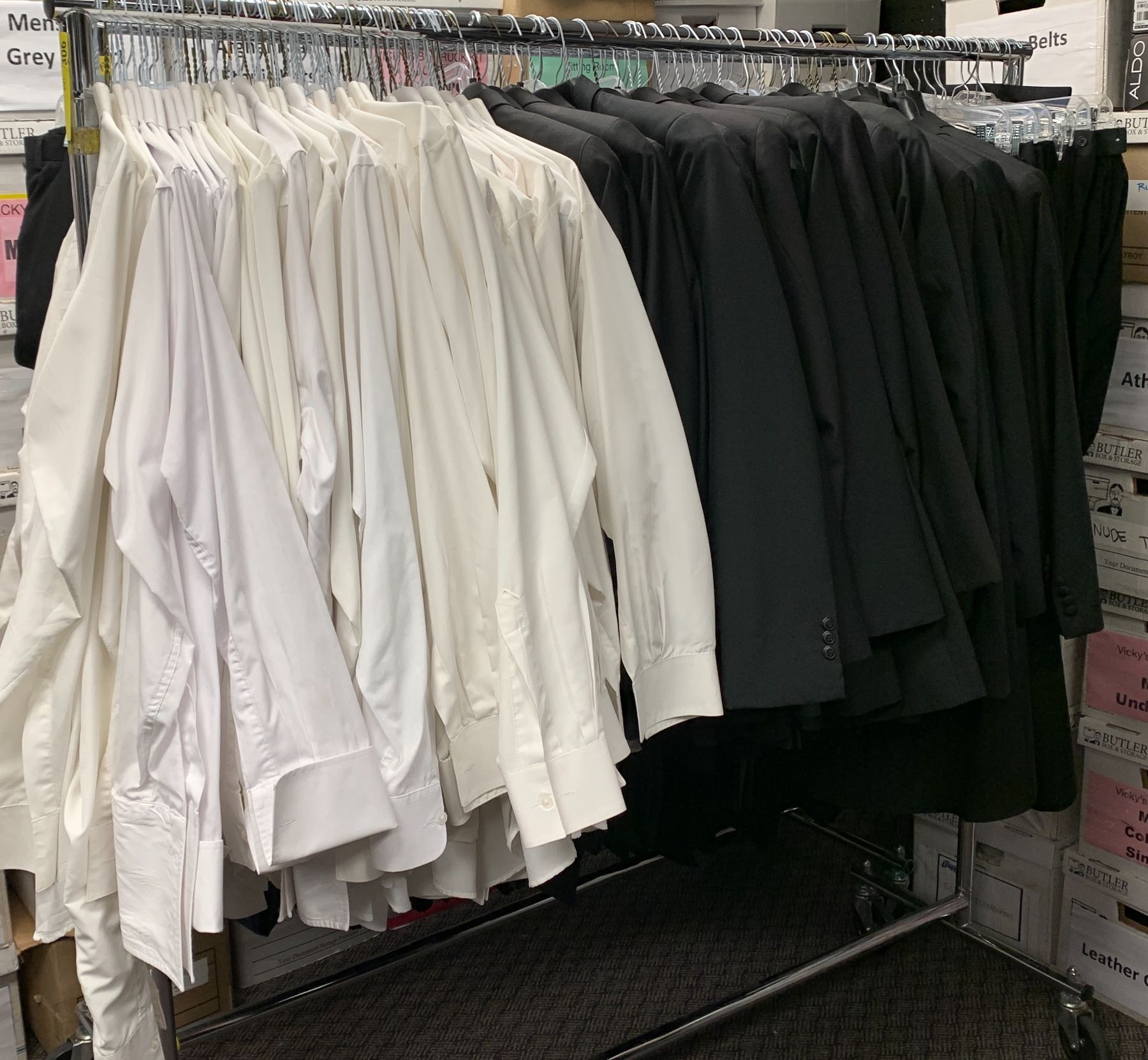 "Superheroes Show" - Rack full of black suit jackets/ black formal pants & full sleeve button shirts (approx. 50 shirts/ 20 jackets & 15 pants)