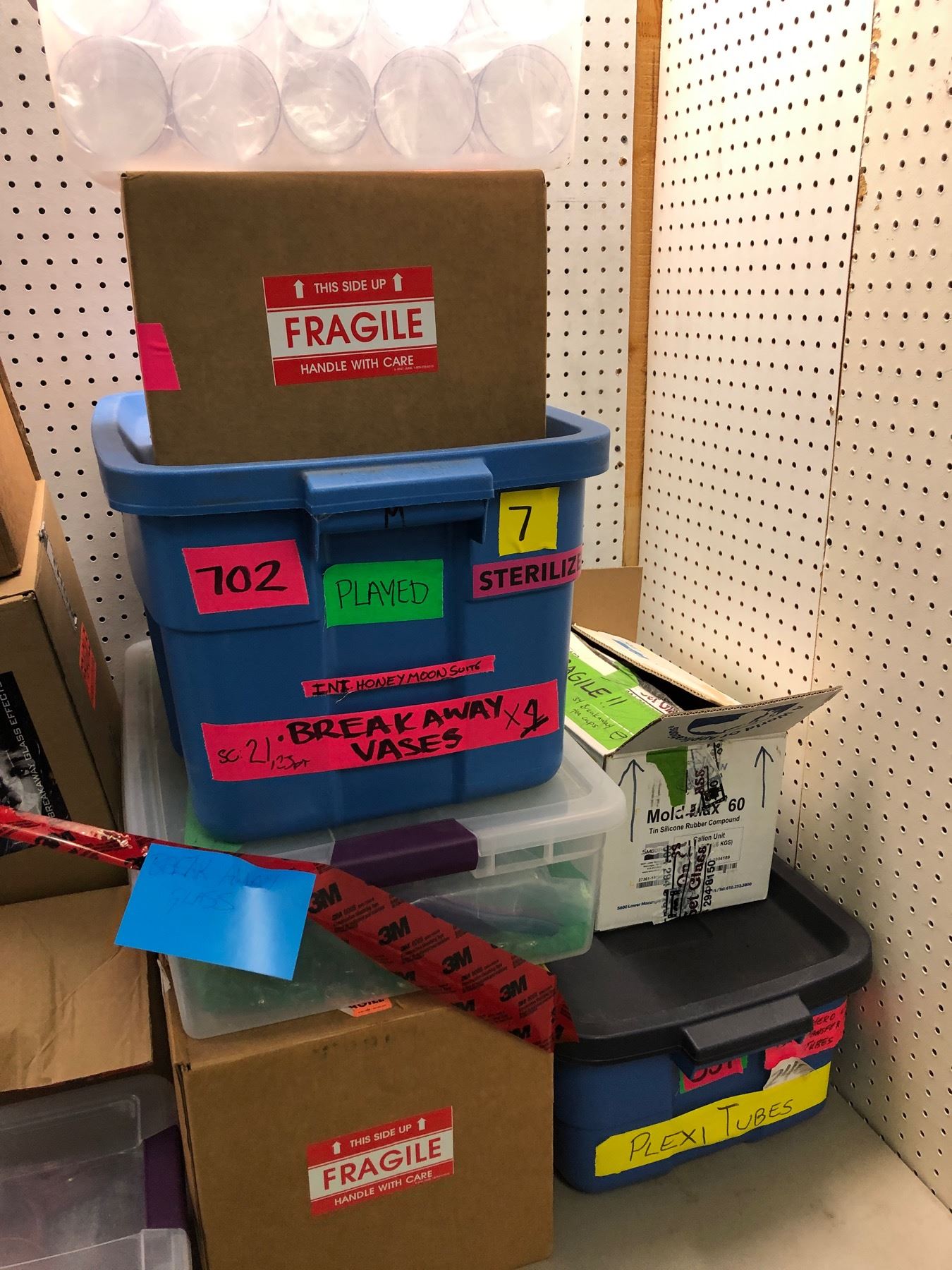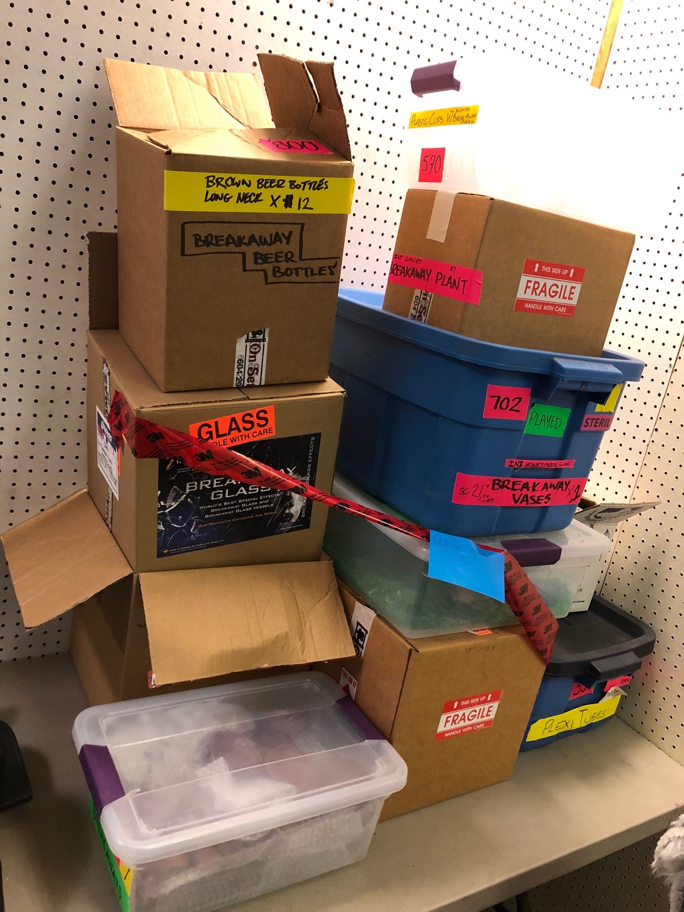 "Superheroes Show" group of set Dec breakaway glass props - includes breakaway beer bottles / breakaway vases (screenplayed) / plexi tubes / plastic cups etc