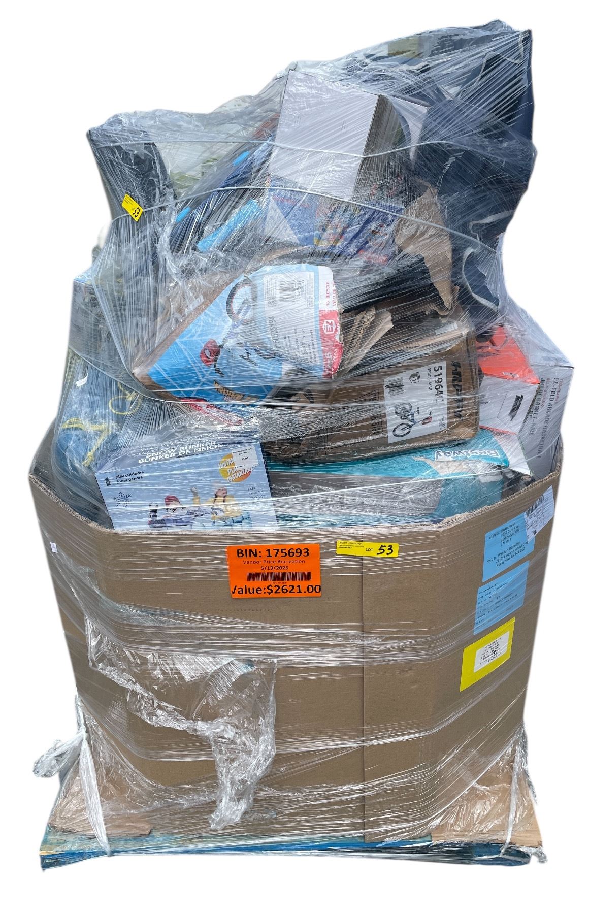 Surprise Pallet of Misc Outdoor and Sports Essentials - (Adjustable Hockey Skates, Kids Bicycle, Inflatable Snow Bunker, Portable Basketball Hoop, Inflatable Hot Tub (Approx. Retail Value: $2,621.00)