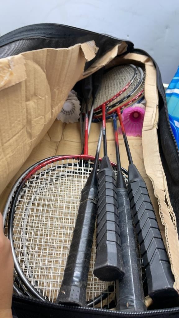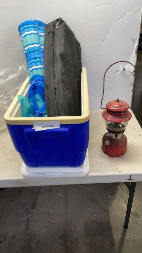 T66 COLEMAN LANTERN AND COOLER WITH BADMINTON SET, BEACH MAT