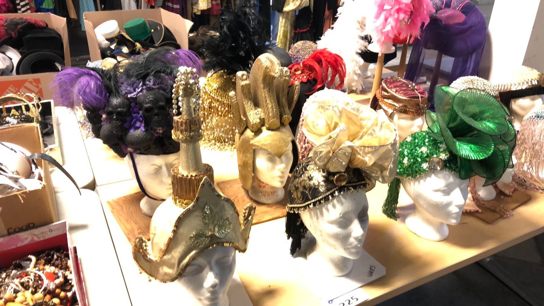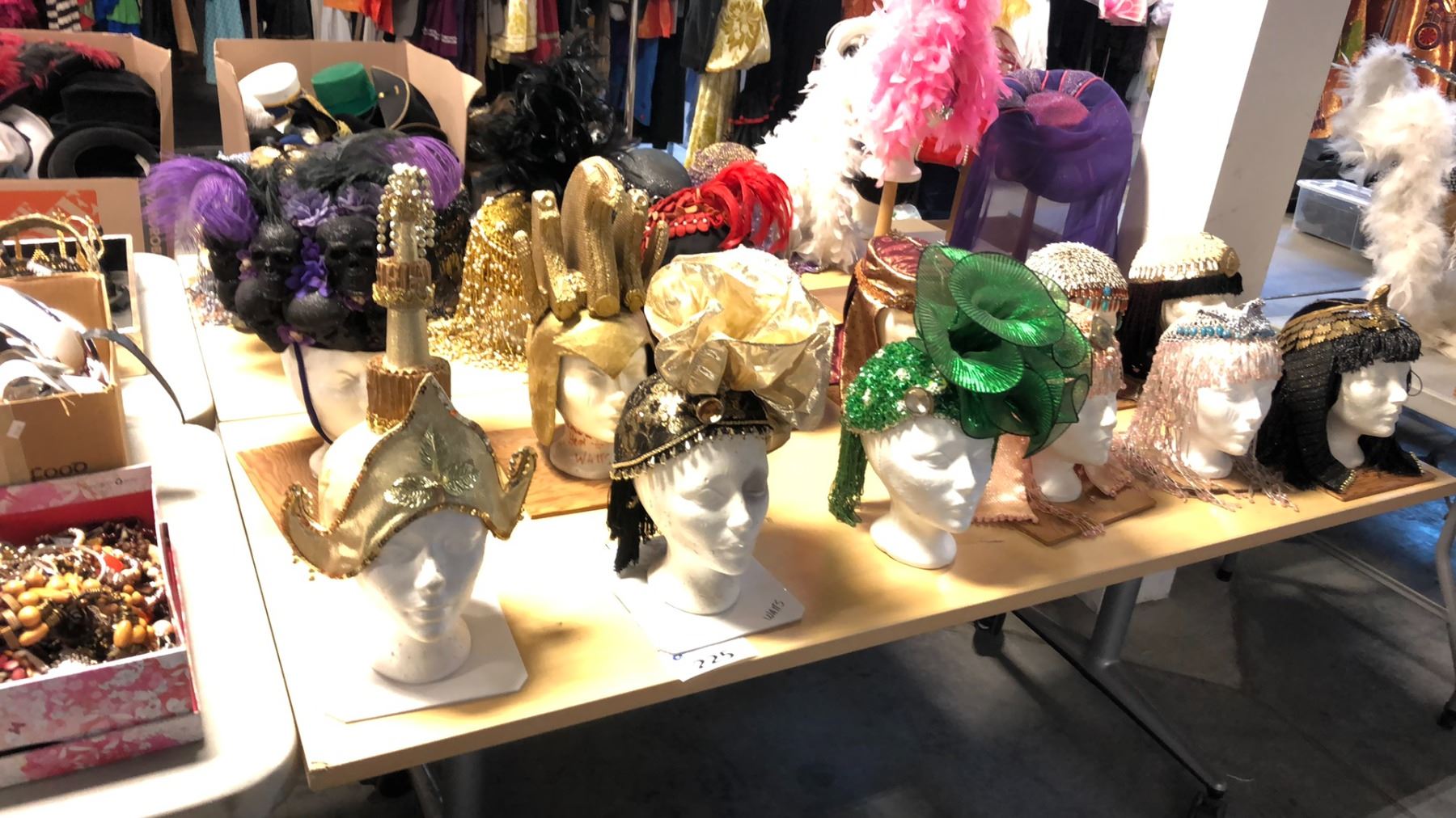 TABLE OF ASSORTED HEAD DRESSES INCLUDING EGYPTIAN, SHOW GIRL, ROMAN, THAI ETC