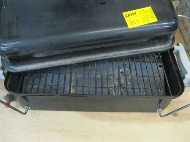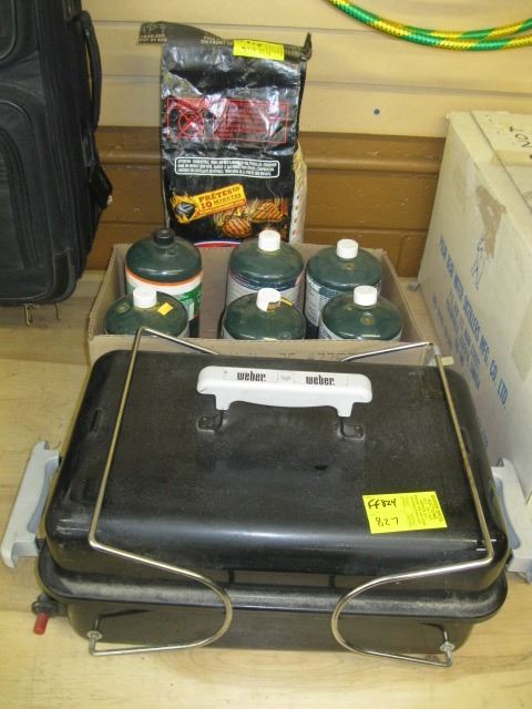 TABLE TOP PROPANE BBQ WITH CANNISTERS & A BAG OF BRIQUETTES. SOME CANNISTERS NEW, SOME EMPTY