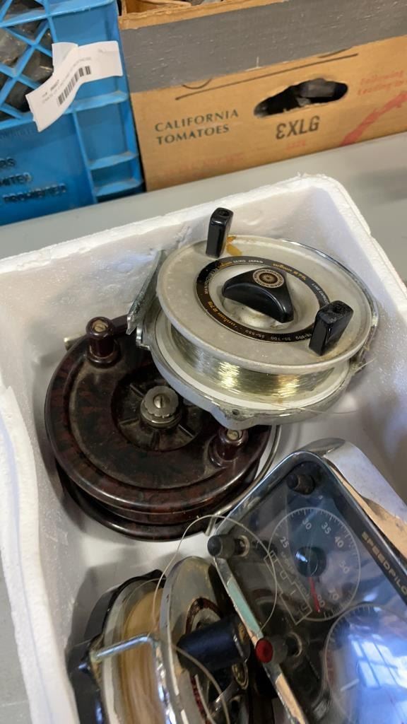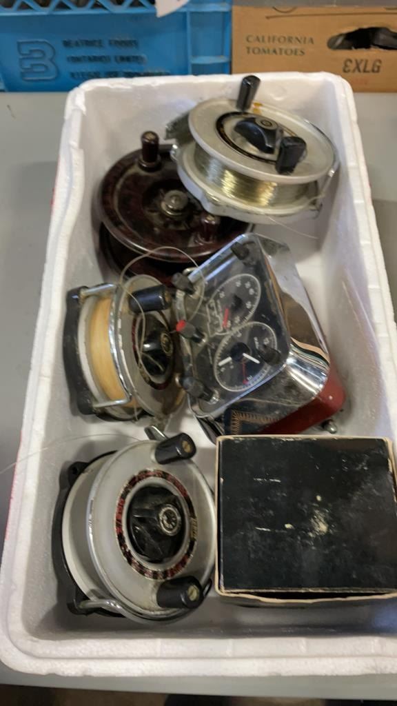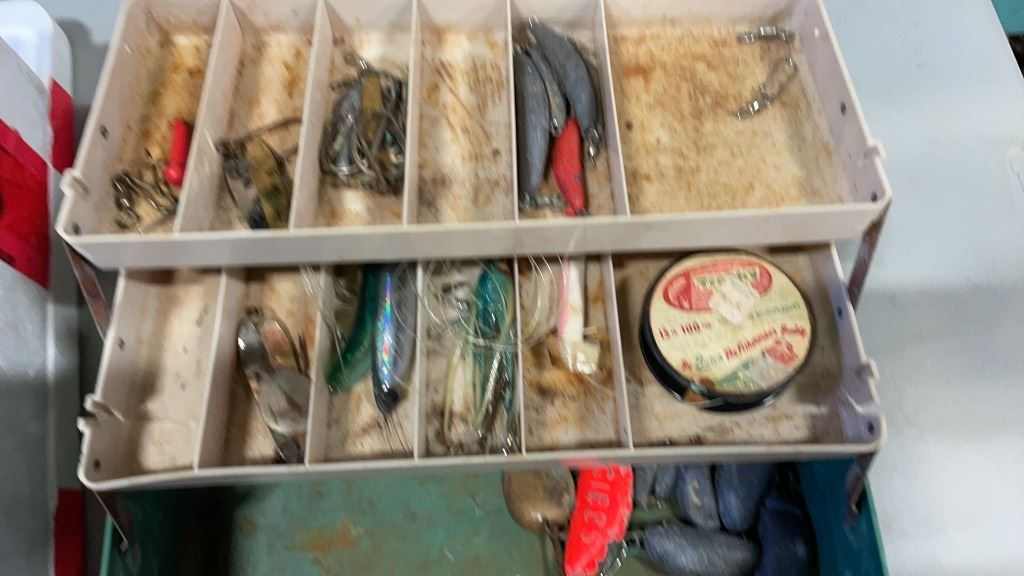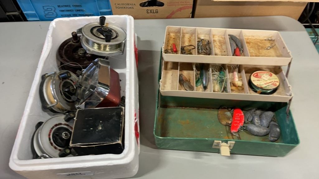 TACKLE BOX WITH CONTENTS AND TRAY OF REELS