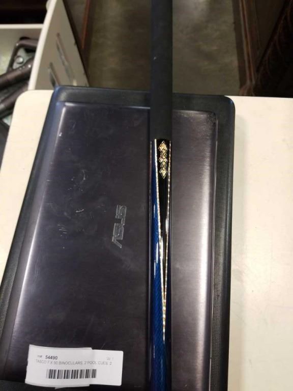 TASCO 7 X 50 BINOCULARS, 2 POOL CUES, 2 LAPTOPS AND DIGITAL CAMERAS, KNIFE SET