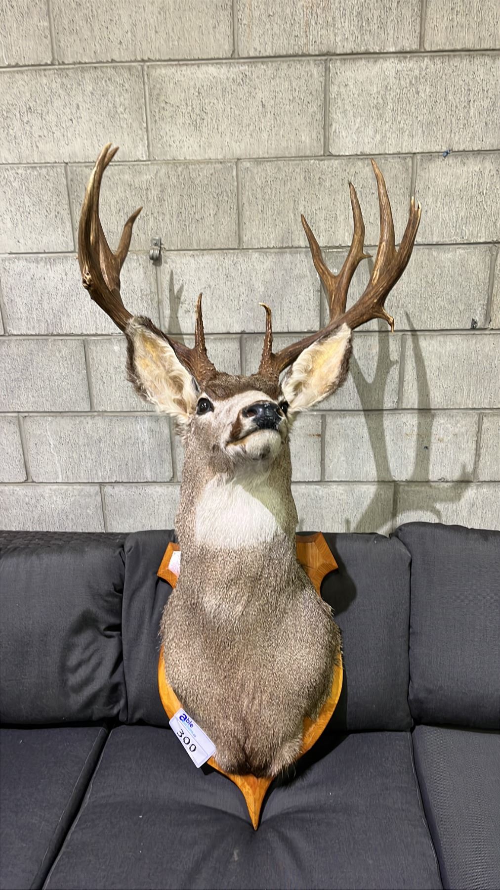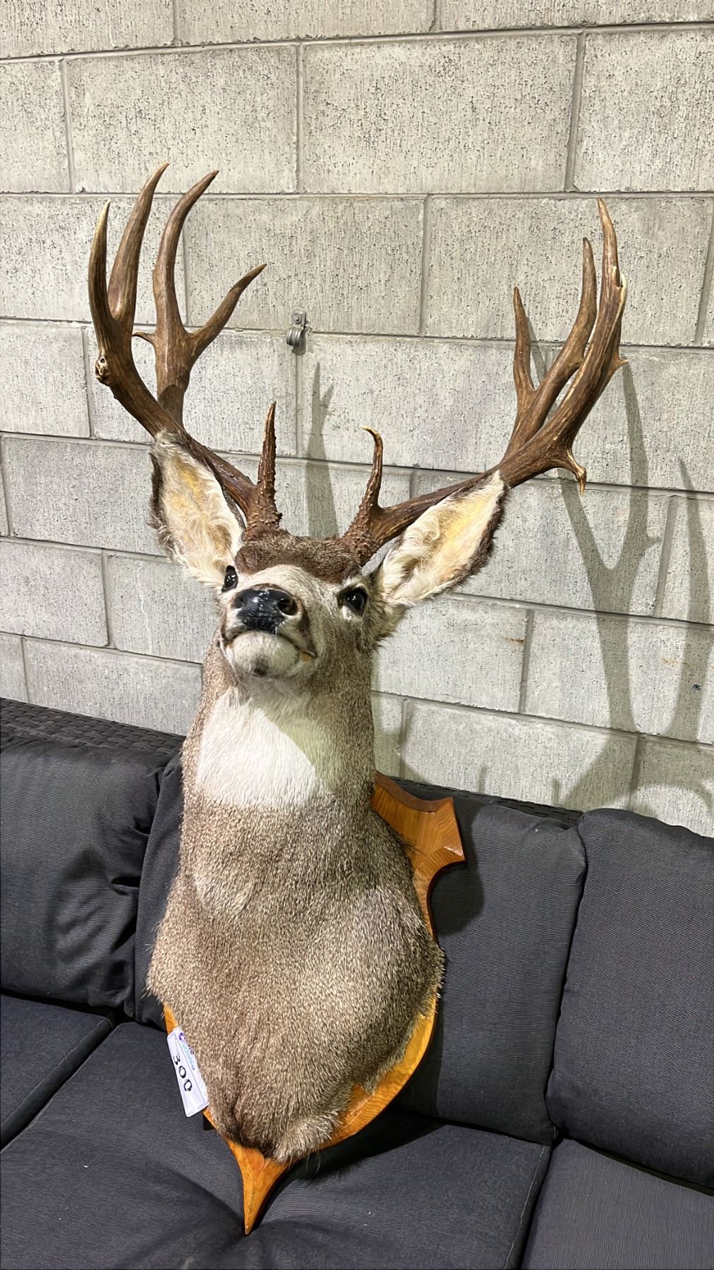 TAXIDERMY MOUNTED DEER HEAD- 29" FROM BASE TO NOSE AND 16" ANTLER SPREAD