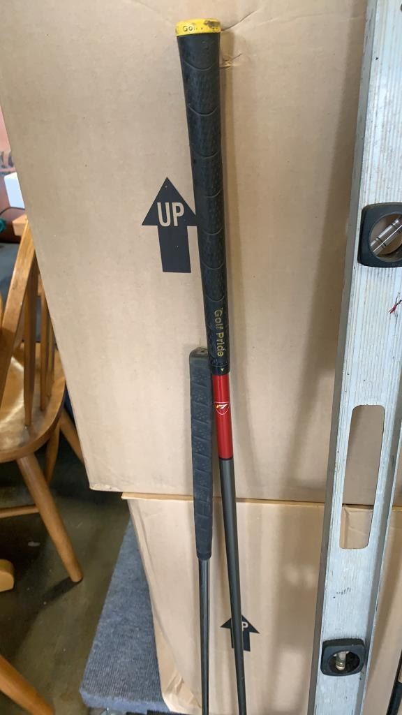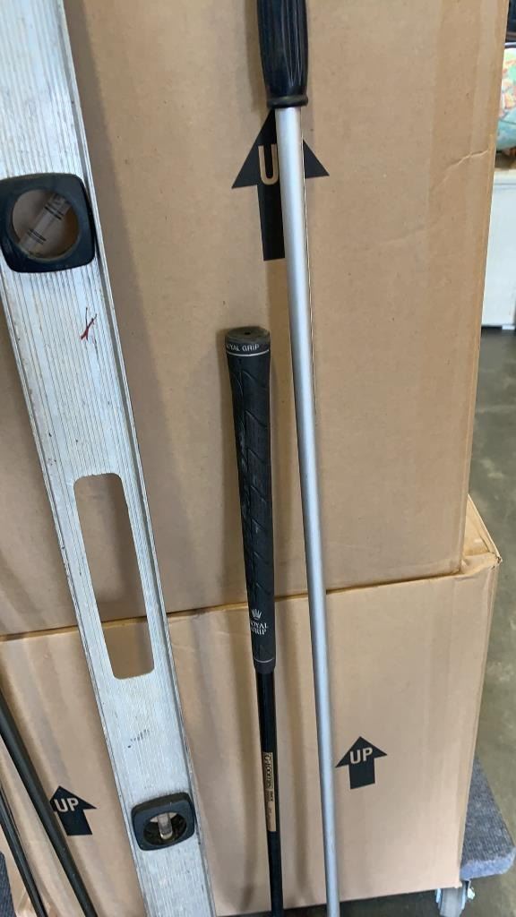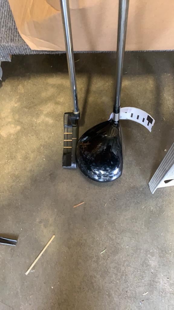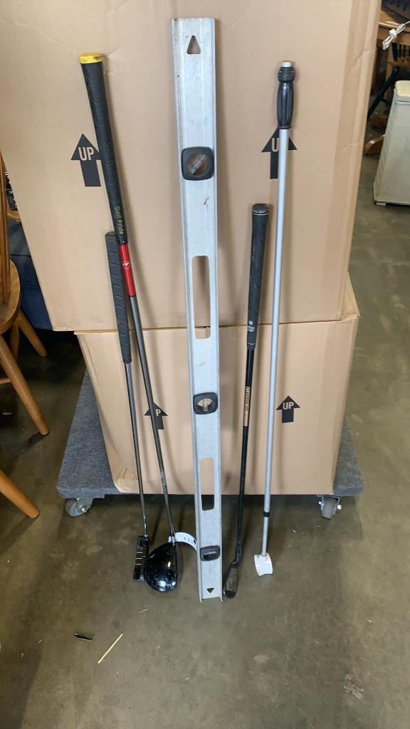TAYLOR MADE RH R7 QUAD DRIVER, GOLF BALL RETRIEVER AND 2 PUTTERS AND LEVEL