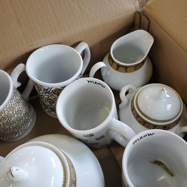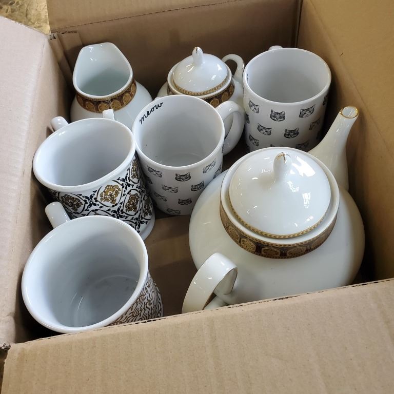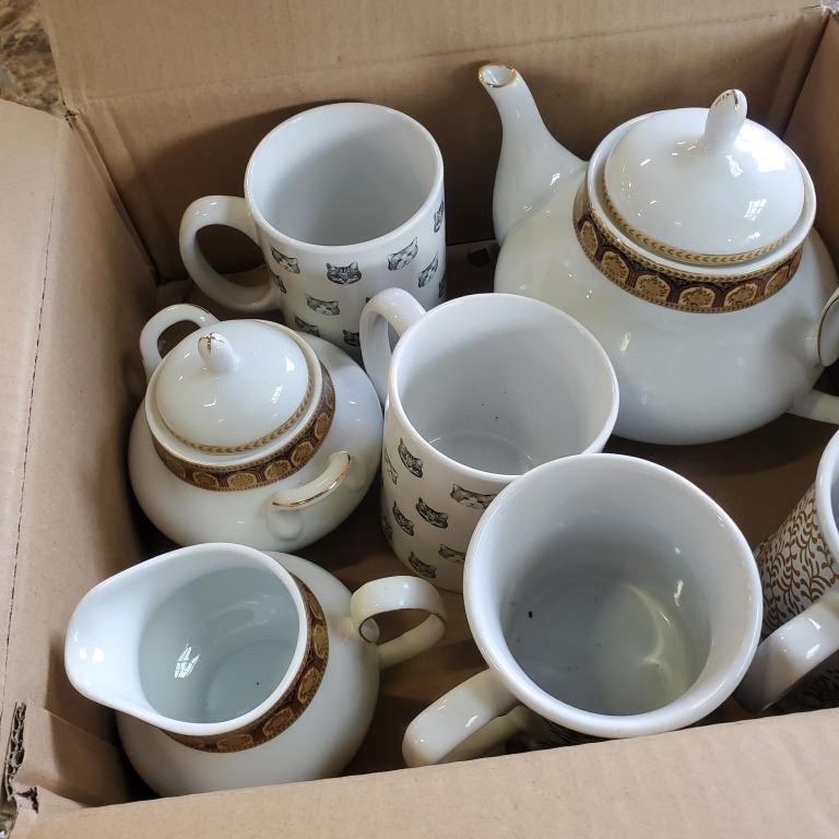 TEA POT, CREAM AND SUGAR PLUS MUGS