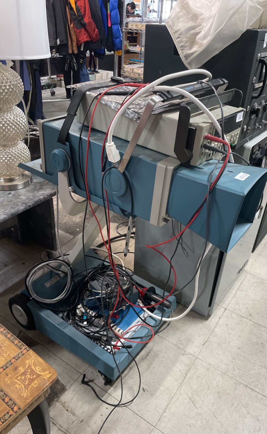 TEKTRONIX 2247A OSCILLOSCOPE COUNTER/TIMER WITH A FLUKE 8840A/AF MULTIMETER ON A MOBILE STAND