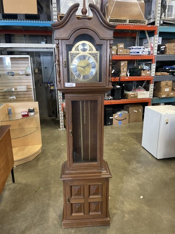 TEMPUS FUGIT WEST GERMAN GRAND FATHER CLOCK WITH WEIGHTS AND PENDULUM