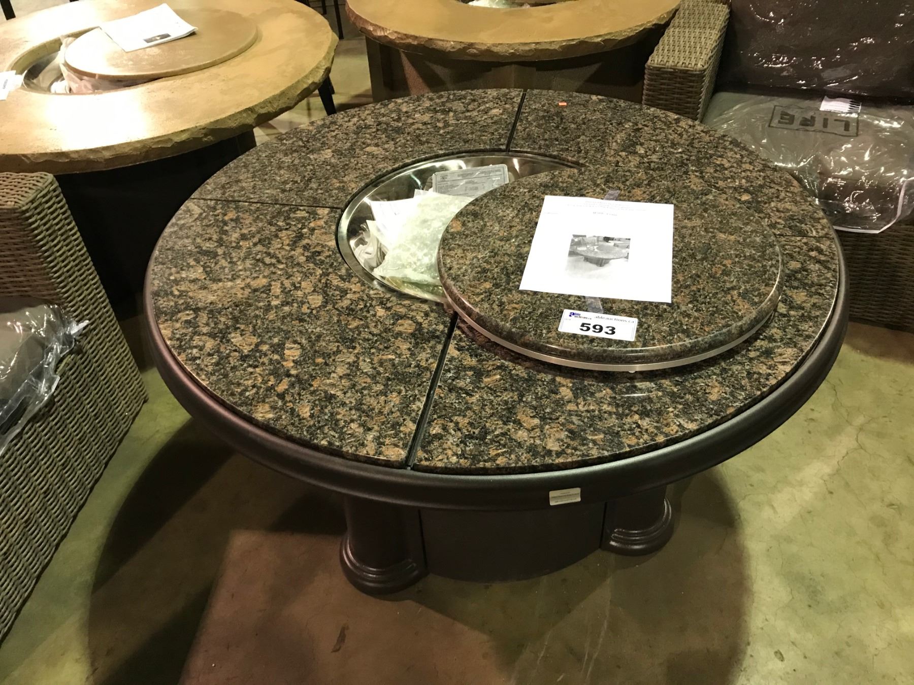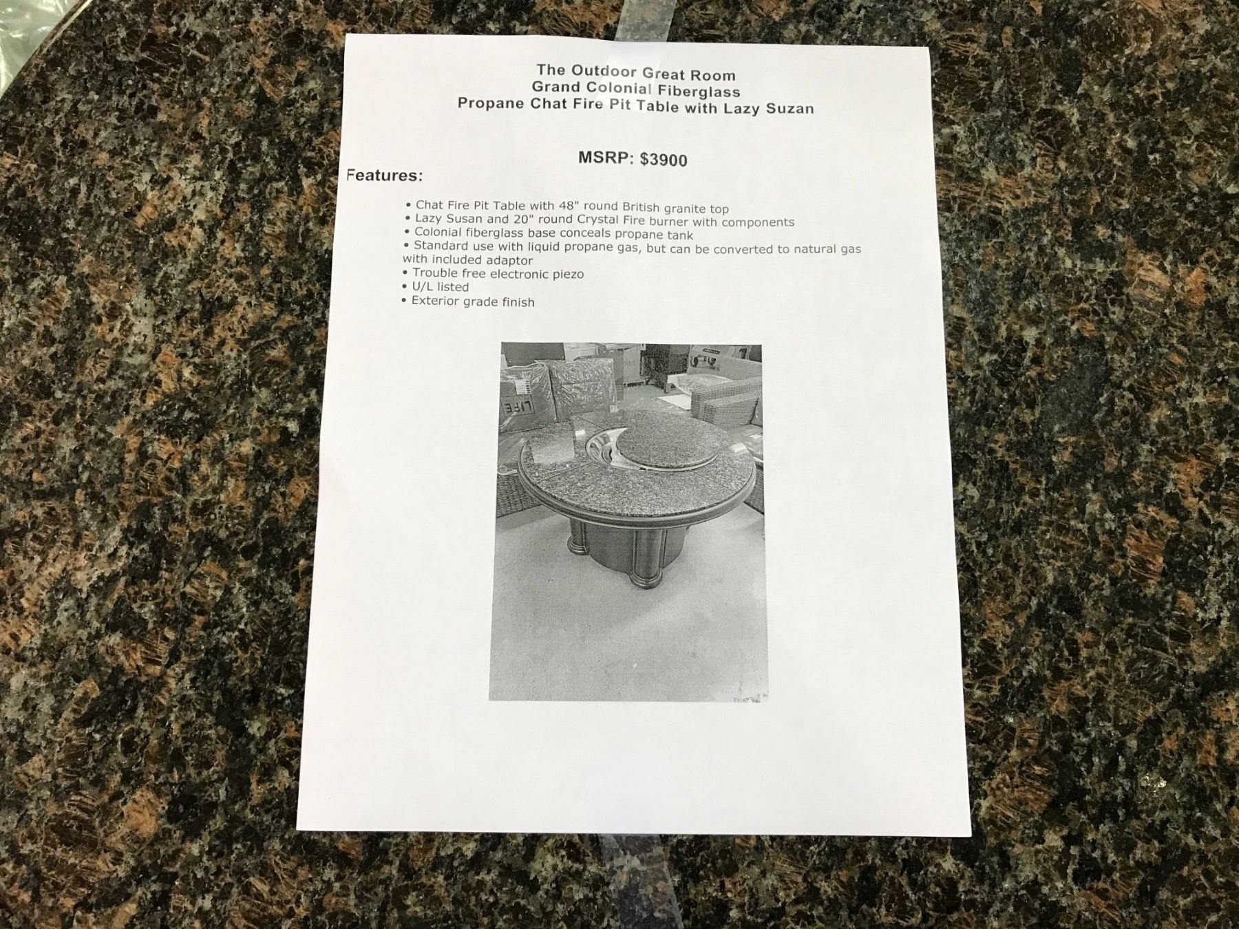 THE OUTDOOR GREAT ROOM GRAND COLONIAL BLACK GRANITE TOP PROPANE PATIO FIRE PIT TABLE WITH LAZY SUZAN MSRP $3,900