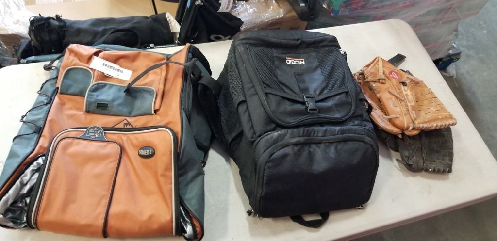 THERMOS BACKPACK, 2 BASEBALL GLOVES AND RIDGID COOLER PACK