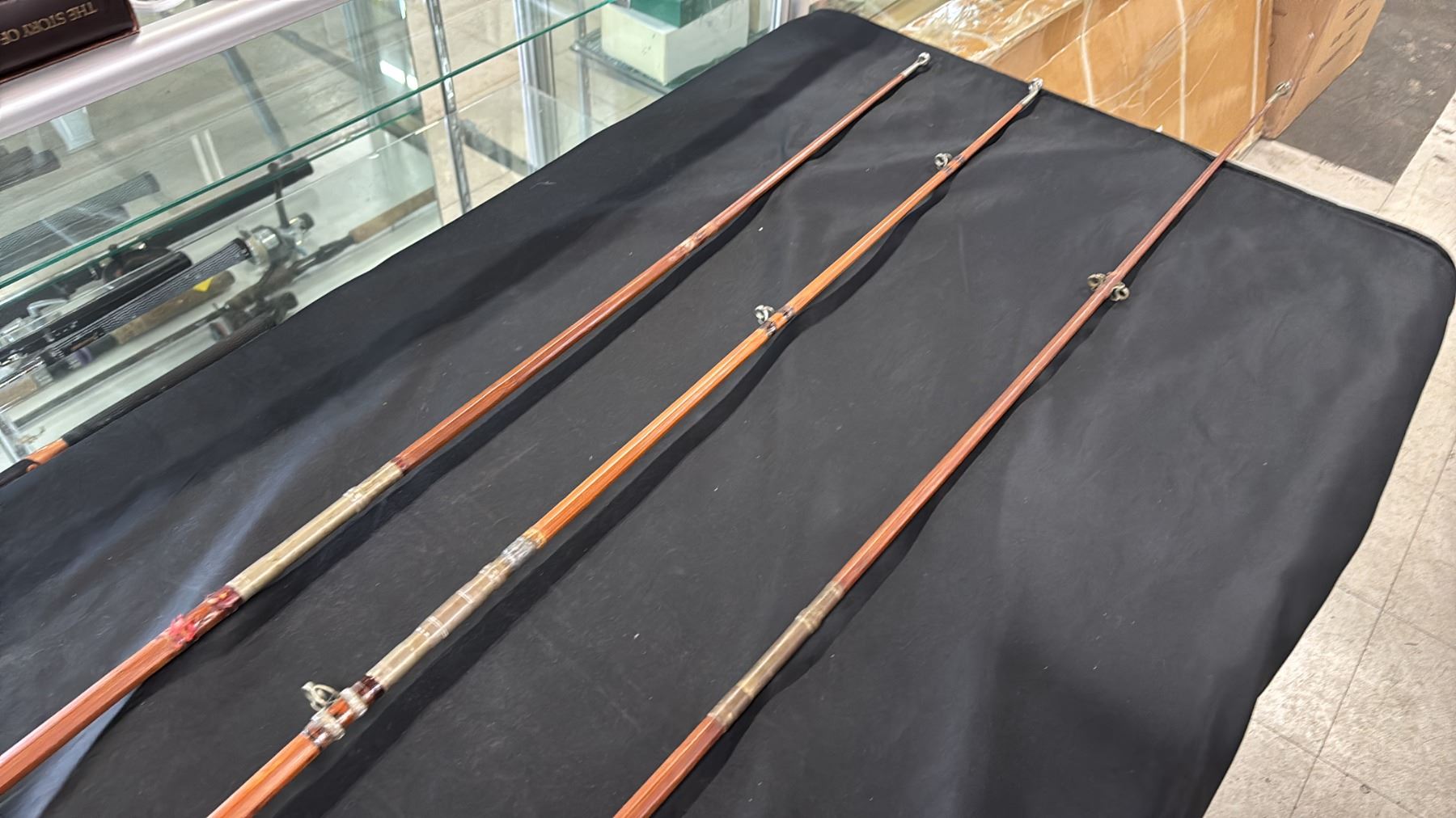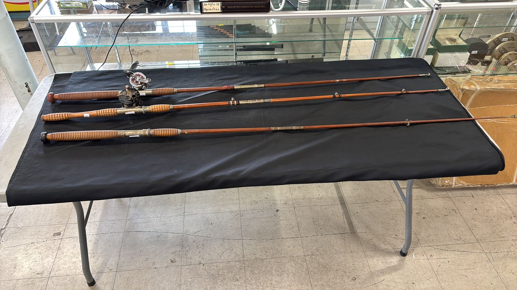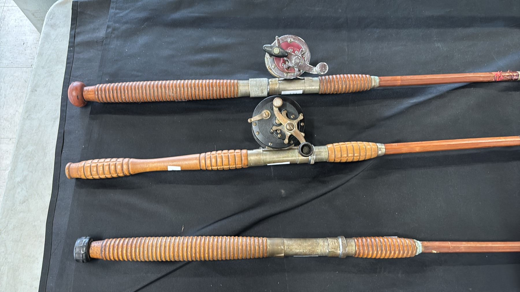 THREE ANTIQUE BAMBOO FISHING RODS WITH 2 REELS