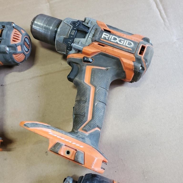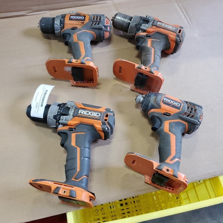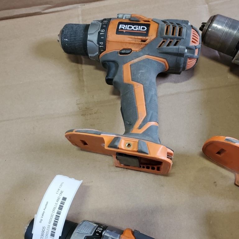 THREE CORDLESS RIDGID DRILLS AND ONE IMPACT, NO BATTERIES