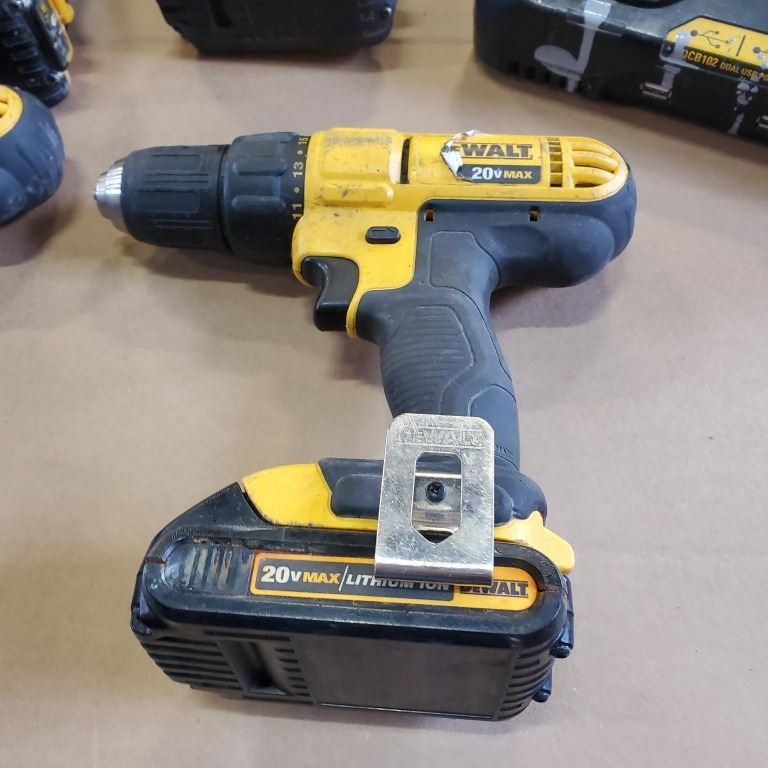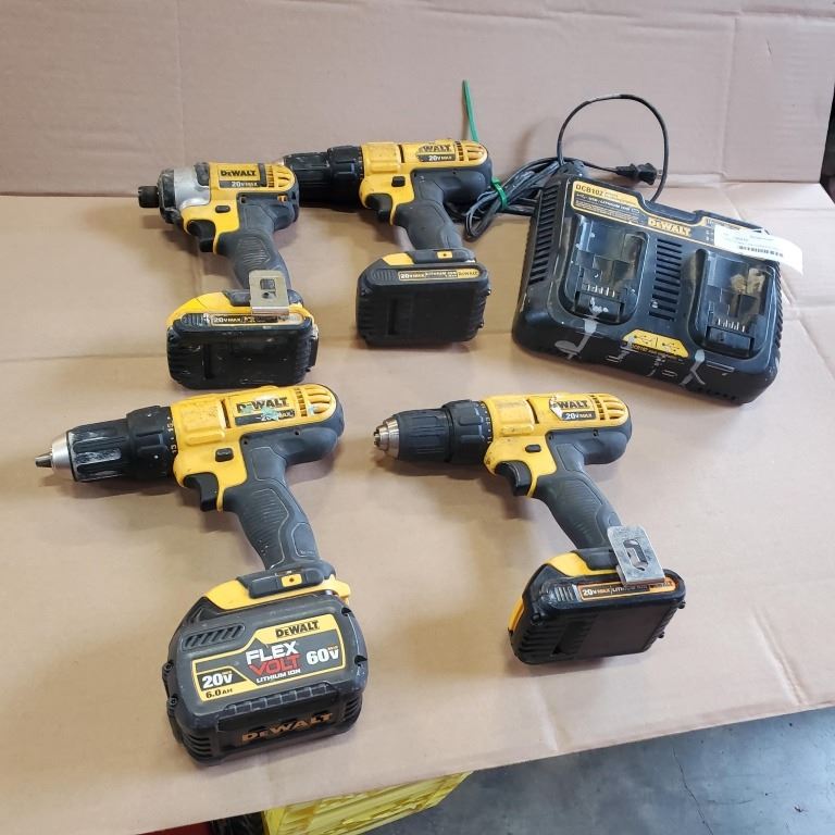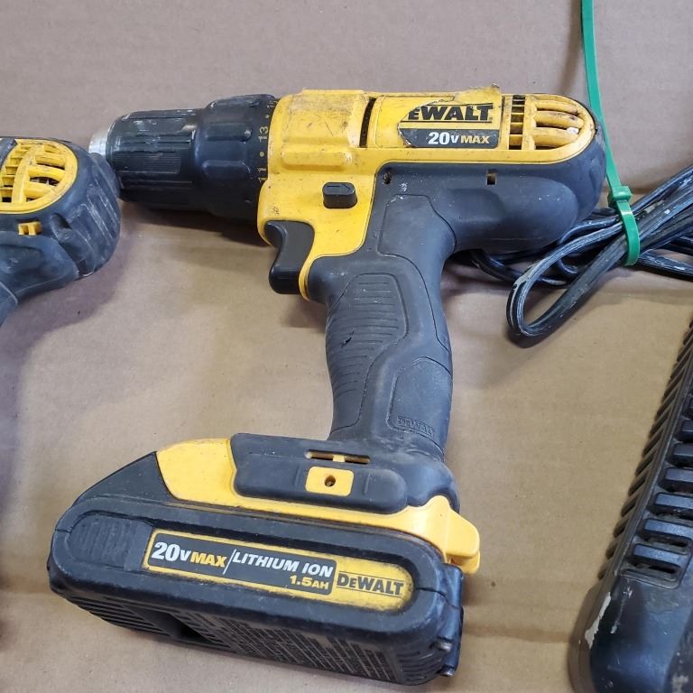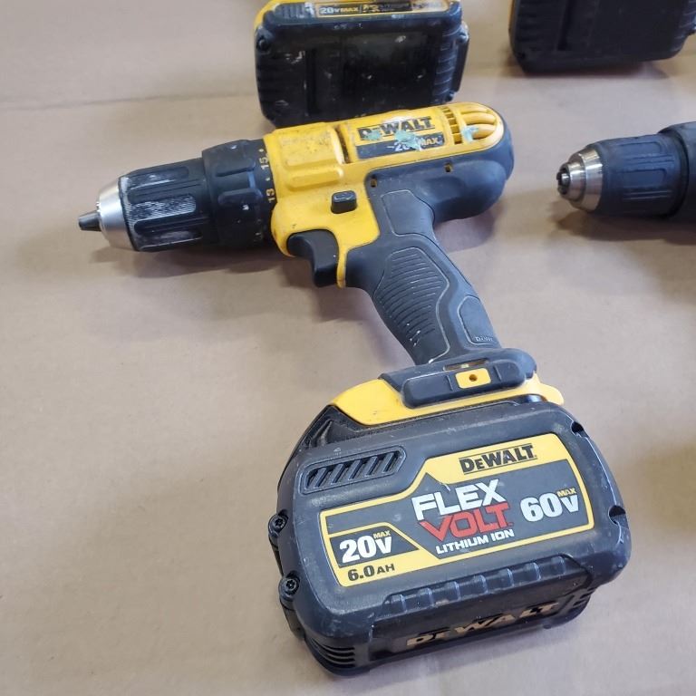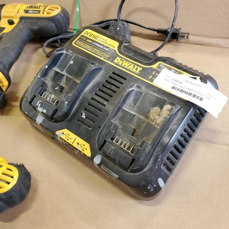THREE DEWALT 20V CORDLESS DRILLS, ONE IMPACT WITH BATTERIES AND DUAL CHARGER