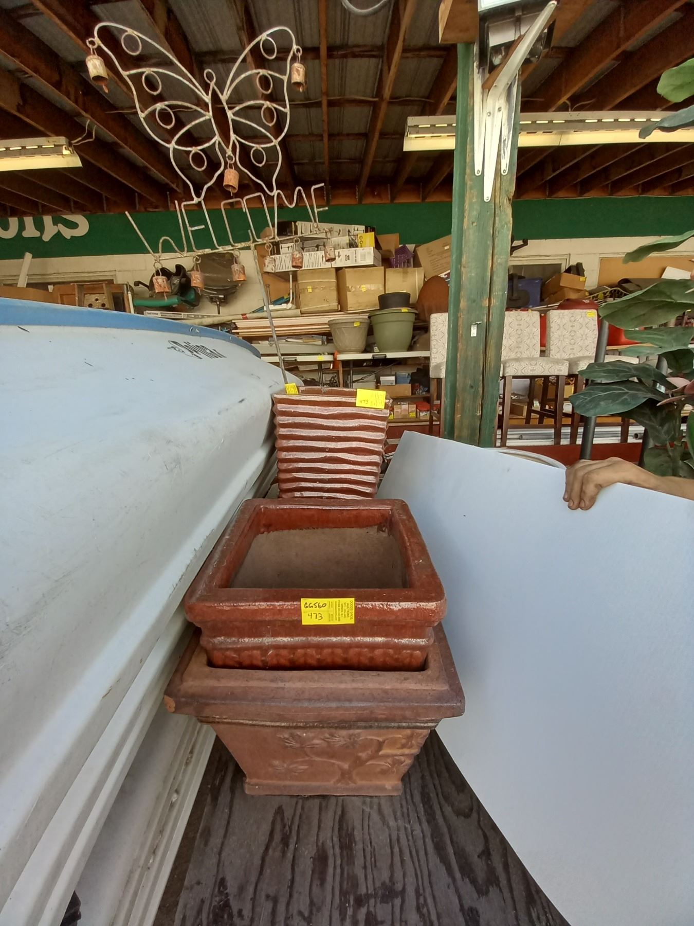 THREE HEAVY CERAMIC PLANTERS AND A METAL WELCOME SIGN