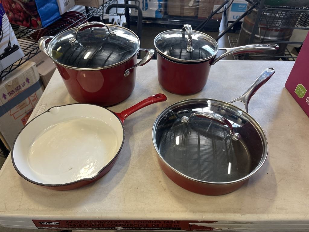 THREE NEW KITCHENAID POTS WITH LIDS AND CAST IRONSKILLET