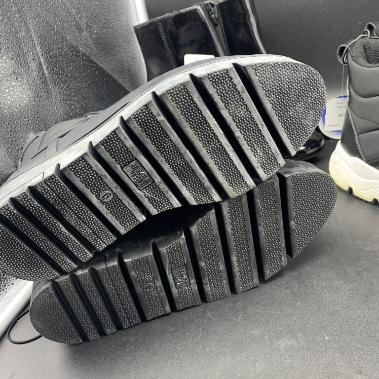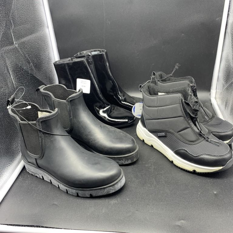 THREE PAIRS OF NEW SIZE 6 BOOTS AND RUBBER BOOTS RETAIL $120