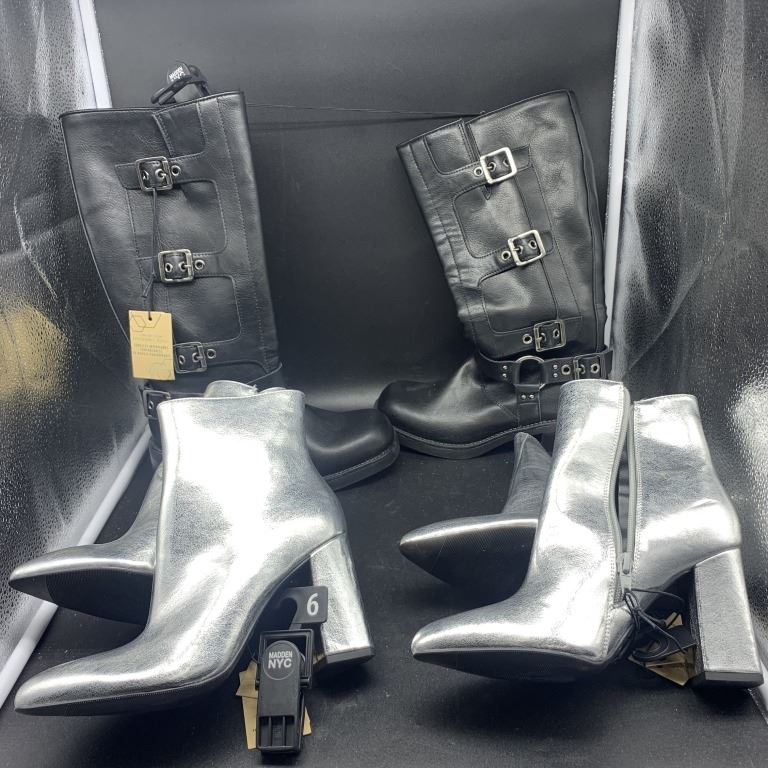 THREE PAIRS OF NEW SIZE 6 MADDEN NYC HIGH HEEL AND LOW HEEL BOOTS RETAIL $180