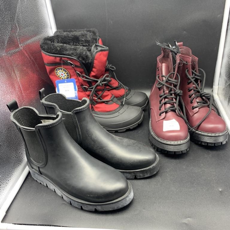 THREE PAIRS OF NEW SIZE 7 WINTER BOOTS, LOW HEEL BOOTS AND RUBBER BOOTS RETAIL $120