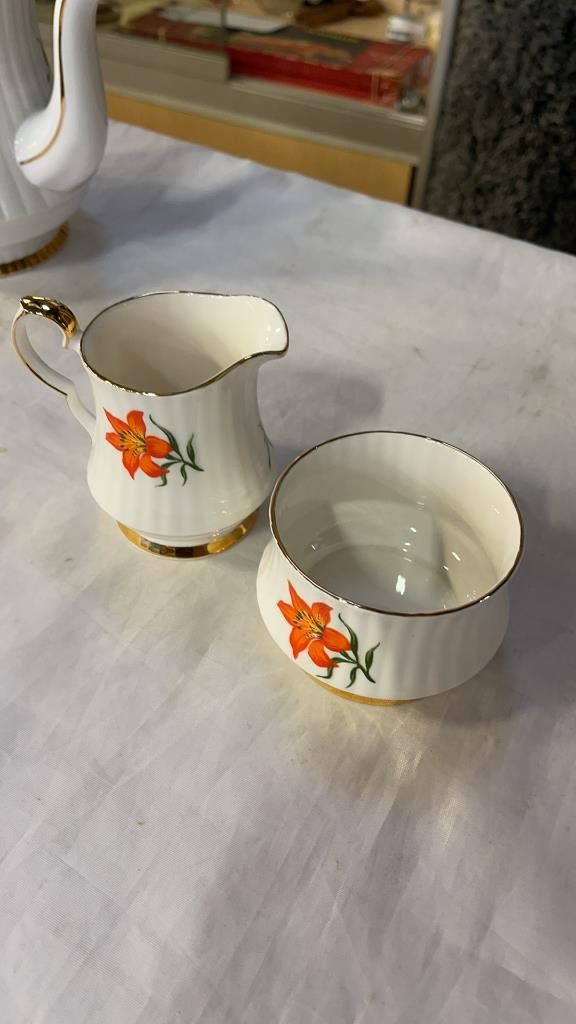 TIGER LILY TEA SET BY QUEENS - TEAPOT WITH LID, CREAM AND SUGAR, 2 MUGS, 4 CUPS AND SAUCERS