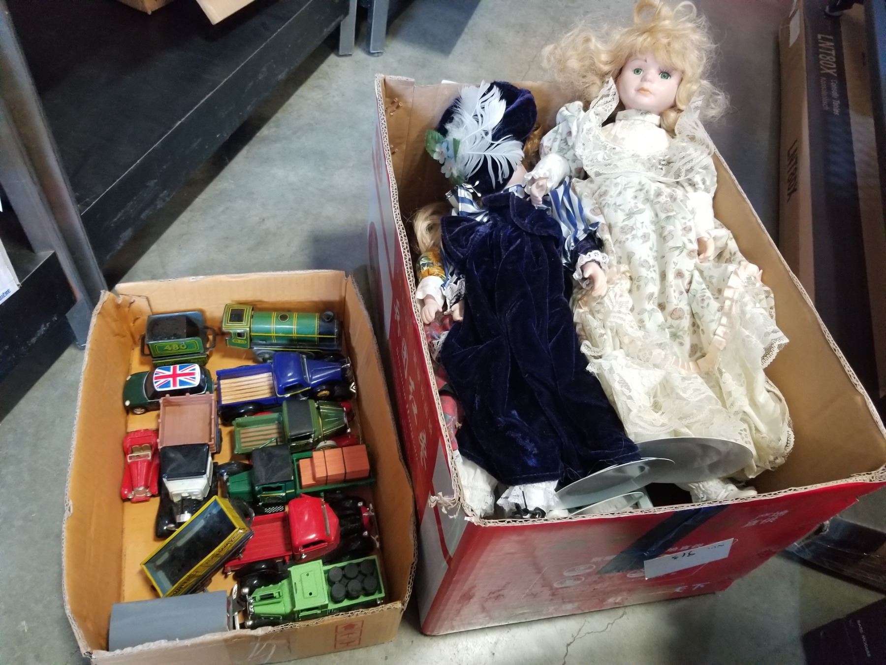 TIN WIND UP TRAIN AND METAL CAR AND TRUCK TOYS AND COLLECTOR DOLLS